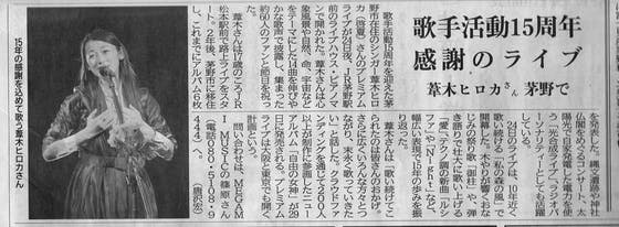 歌手活動15周年を迎えた茅野市在住のシンガー葦木ヒロカ(啓夏)さんのプレミアムライブが24日夜、JR茅野駅前のライブハウス・ピアノマンで開かれた。葦木さんは心象風景や自然、命、宇宙などをテーマにした14曲を伸びやかな歌声で披露し、集まった約60人のファンと節目を祝った。