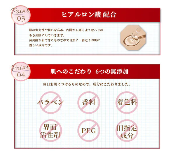 ヒアルロン酸など厳選された成分を採用し、配合しています。