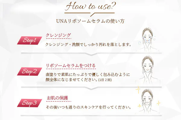 今まで高い美容液を使ってましたがどれも微妙で効果がよく分からなかったのにUNAリポソームセラムはすごいです!洗顔後に付けた瞬間、お肌に吸い込む吸い込む!