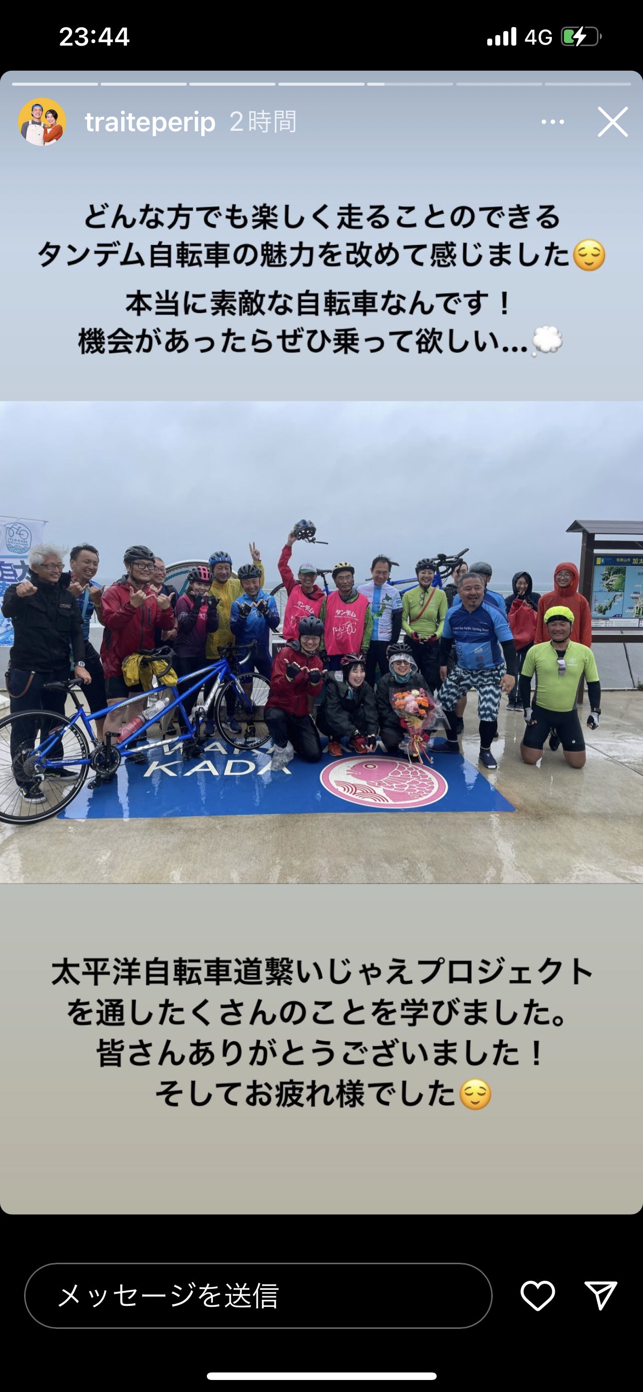 おはようございます!太平洋岸自転車道をタンデム自転車でみんなで繋ぎたい!企画 ご支援本当にありがとうございます!あと3日後には、私たちは銚子市に向けてタンデムを積んで出発します。企画スタートし、走行する前にご支援をいただいた方の、お許しいただける可能な方について私たちのホームページの支援者の方としてのお名前、ロゴをホームページに掲載させてもらいたいと思います。ただ、キャンプファイヤーの方からは、このプロジェクトが、まだ終了していないため連絡先情報等の共有が、私にされていない状況です。どうか、ホームページにより多くの支援をいただいた方の、お名前、ニックネーム、ロゴを掲載したいと思いますので掲載可能な方、このキャンプファイヤーのメッセージ機能を使って「掲載可能のお名前、またはニックネーム」をお送りいただけないでしょうか??ロゴ掲載の方は、メッセージで、おそらくロゴが送れないと思いますので、その旨もご連絡ください。お手数をおかけして申し訳ないのですが、できれば、開催前に、ホームページにお名前などたくさんあげさせていただければ嬉しいので、ご協力をお願いいたします。