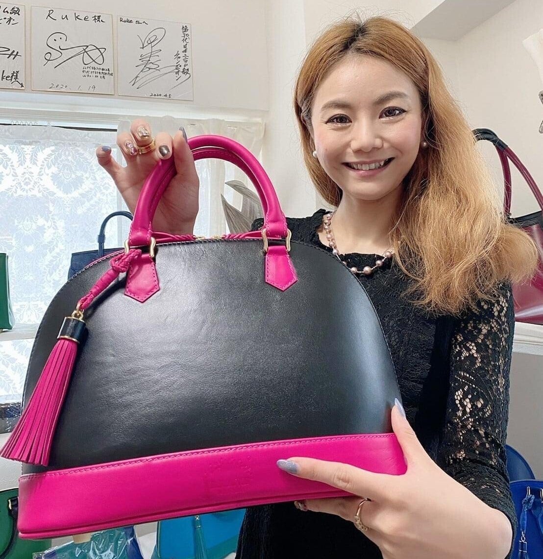 彼女のオーダーは、大好きだというピンク(フシアピンク)とブラックの牛革コンビネーションのハンドバッグ。