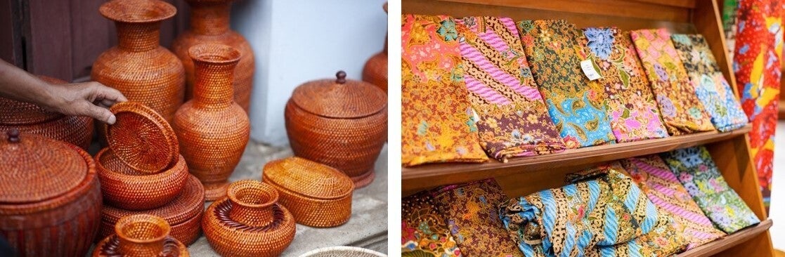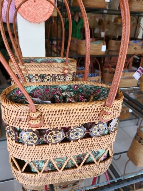 バリ島にはいろいろな産業がありますが、民芸品として有名なのがアタ製のかごやバッグ、ろうけつ染めの布「バティック」。