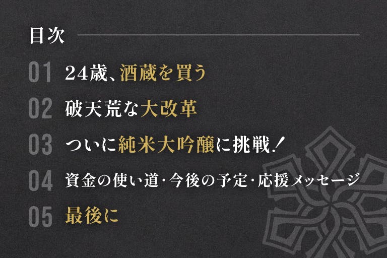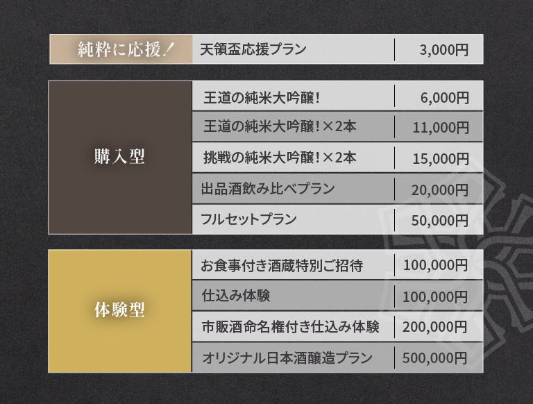 以上の3つを皆様にお届けします!今後もっと多くの人に喜んでいただけるような高品質のお酒を造るためには、より多くの設備投資が必要です。 天領盃酒造の幕開けを担う挑戦をどうぞ応援よろしくお願いいたします!