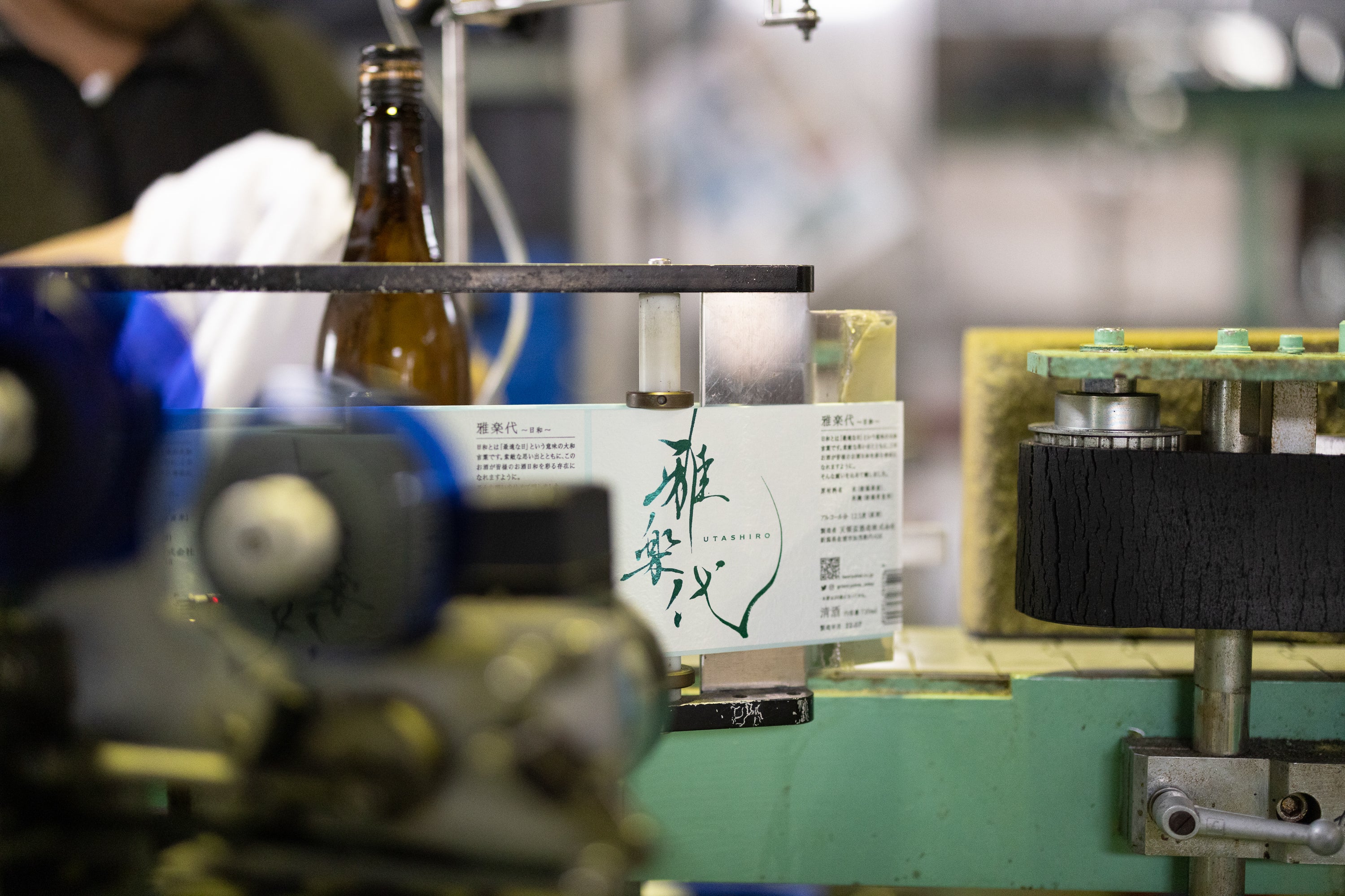 古めかしいラベラーで、新たなお酒「雅楽代」が製造される様子