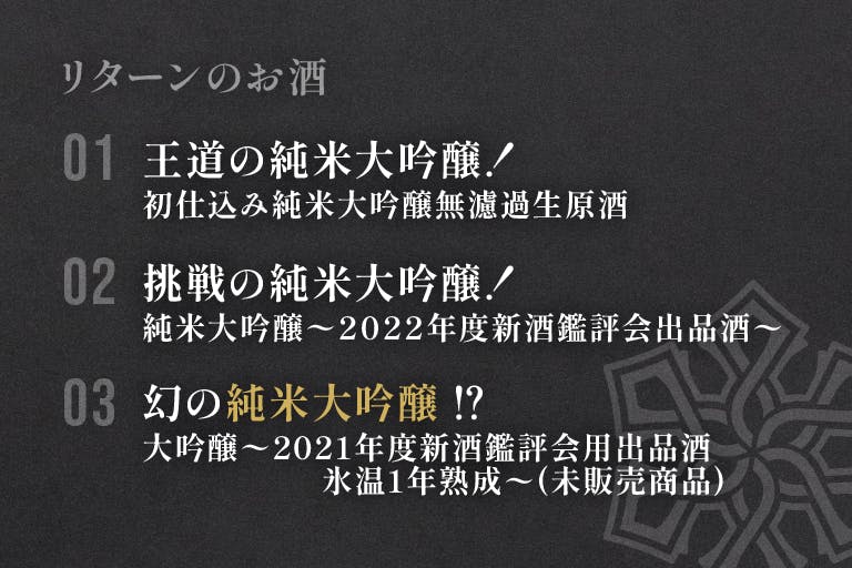 今回のリターンは、2種類の純米大吟醸と、ちょっと特殊なお酒を1つご用意しました!