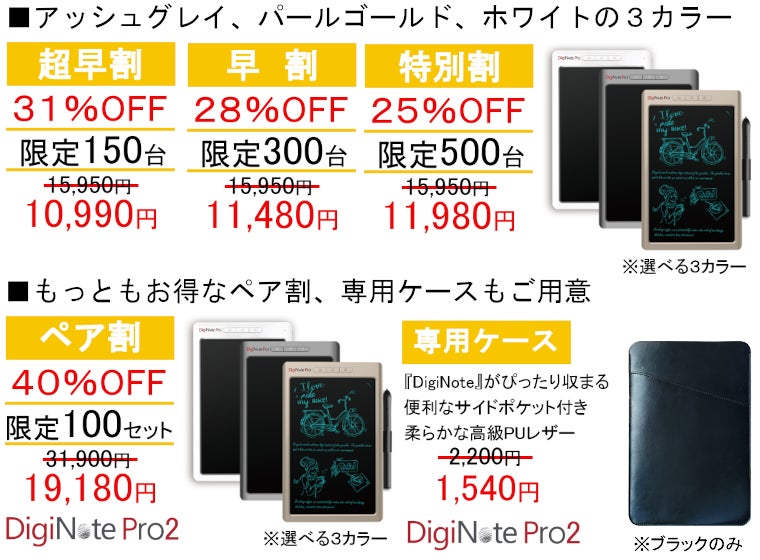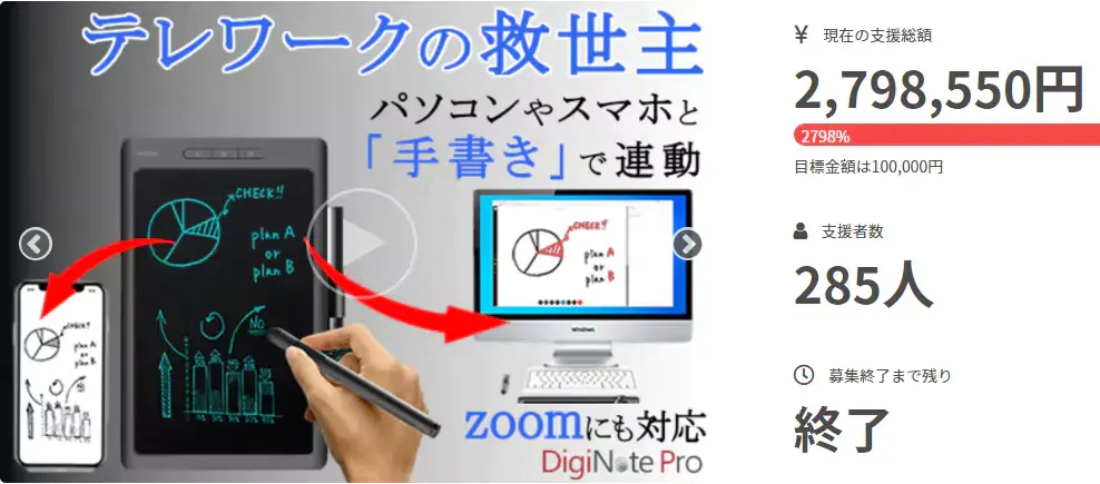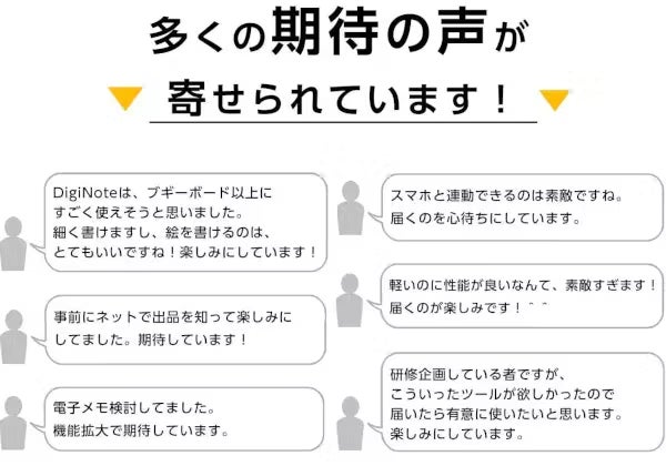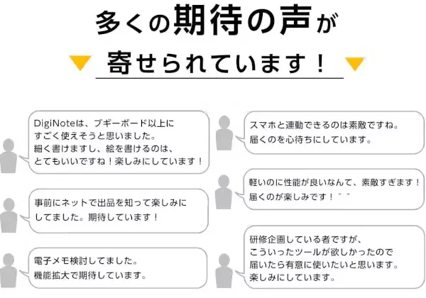 2023/12/09 12:00お世話になっております。MKトレードです。本日、『T-Note2』を公開させていただきました!大変反響をいただいた初期モデル『T-Note』発表から2年が経ちました。充電ポートが待望のType-Cとなりました。今回もツバメノート社推奨デジダル文具として、ツバメモA5(方眼)が付属します。★新商品『T-Note2』https://camp-fire.jp/projects/view/719281『T-Note2』は、メモ帳やノートに書くようにパソコンやスマホに書き写すことができます。①手書きメモをリアルタイムで「デジタル化」②パソコン上に「手書き」で同時表示出来、オンライン会議にも使用できる!③専用スマホアプリで同時描写もできる!④「ツバメノート」の『ツバメモA5』を付属!書きやすいフールス紙⑤「スタイラスペン先」を使って紙を節約!お得なリターンは「数量限定」となります。この商品をもっと多くに方々に知っていただきたいと思っておりますので、SNSなどでのシェアなど大歓迎です!ぜひお見逃しなく、ご検討をどうぞ宜しくお願いいたします!---------------------------------------------------■リピーター様向けキャンペーン■今回のプロジェクト『T-Note2』をご支援いただいたリピーター様に対して「先着50名様 オリジナルポケットメモ帳プレゼント」いたします!★応募方法★今回のプロジェクト『T-Note2』をご支援のうえ、「メッセージを送る」より下記を記載してご応募ください。・過去にご支援くださった弊社プロジェクトの商品名・過去支援ID・氏名---------------------------------------------------最後まで、どうぞよろしくお願いいたします。https://camp-fire.jp/projects/view/719281『T-Note2』プロジェクトスタッフ一同************************************************************★同時開催中プロジェクト『DigiNotePro3』画期的な電子タブレットhttps://camp-fire.jp/projects/view/717657++++++++++++++++++++++++++++++++『LetSketch』300dpi小型サーマルプリンターhttps://camp-fire.jp/projects/view/681331追加購入などに便利な「MKTrade限定公開ショップ」もぜひご覧ください♪https://mktrade2.official.ec/ もっと見る