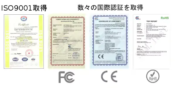 会社の急速な発展に伴い、常に管理レベルの向上につとめ品質マネジメントシステムISO9001も取得しています。各製品はCE、FCC、FDAなどによって国際的安全基準をクリアしています。