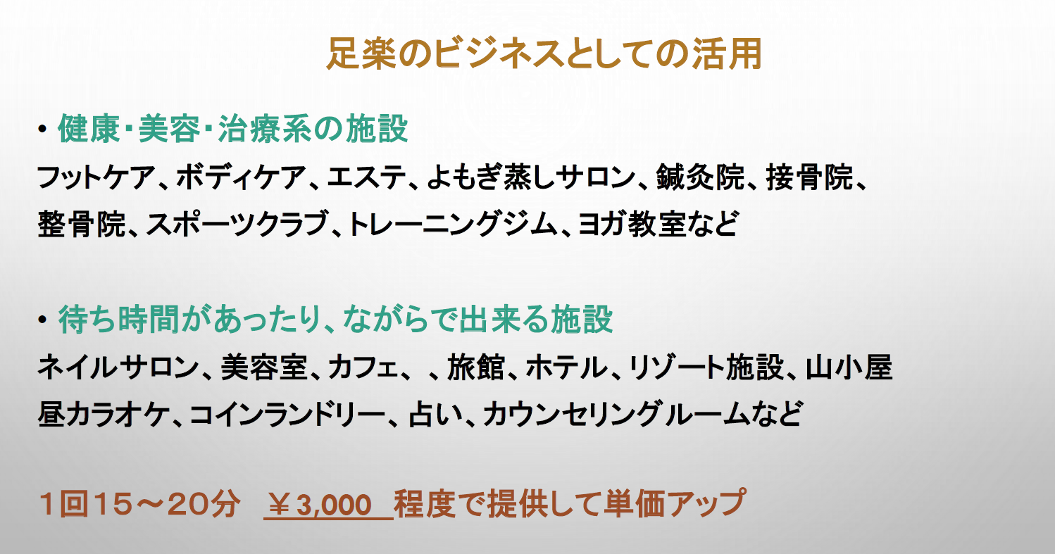 足楽を導入するだけで、それ自体での収入はもちろんのこと、オンリーワンのサービスとして他店との差別化が図れ、お店の集客にも貢献できるはずです。