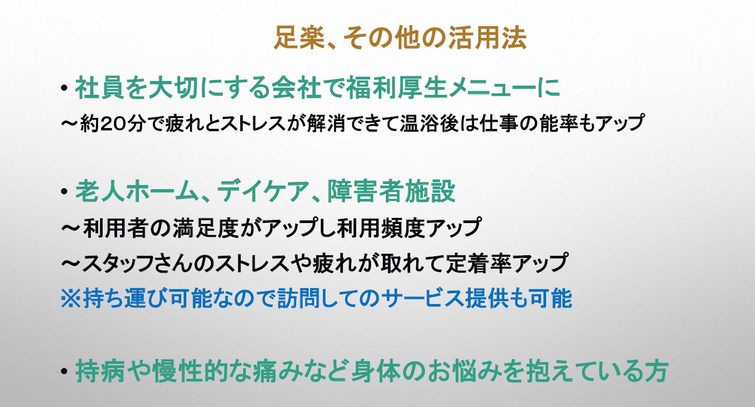 導入して間もないのですが、体験時に片足を入れた際に、「あ!すごい!」とおっしゃり、大半のお客様が体験終了後には、「足が楽になった!」と感想をいただけるので、“足楽”の事を伝えると、とても共感しつつたいへん喜んでいただけています。