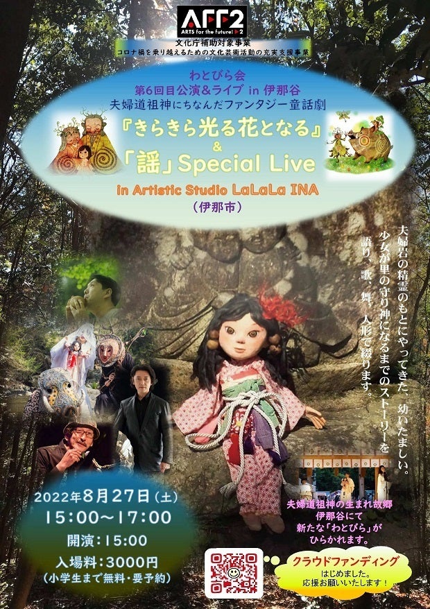 伊那谷で夫婦道祖神にちなんだ童話劇を観て欲しい! 私たちの童話劇「きらきら光る花となる」は、安曇野の夫婦道祖神がモデルの物語ですが、今回ご縁が重なり、伊那市での初公演にて新シーンを創作します。 夫婦道祖神のふるさと、伊那谷での童話劇の初披露、初創作に応援お願いいたします!