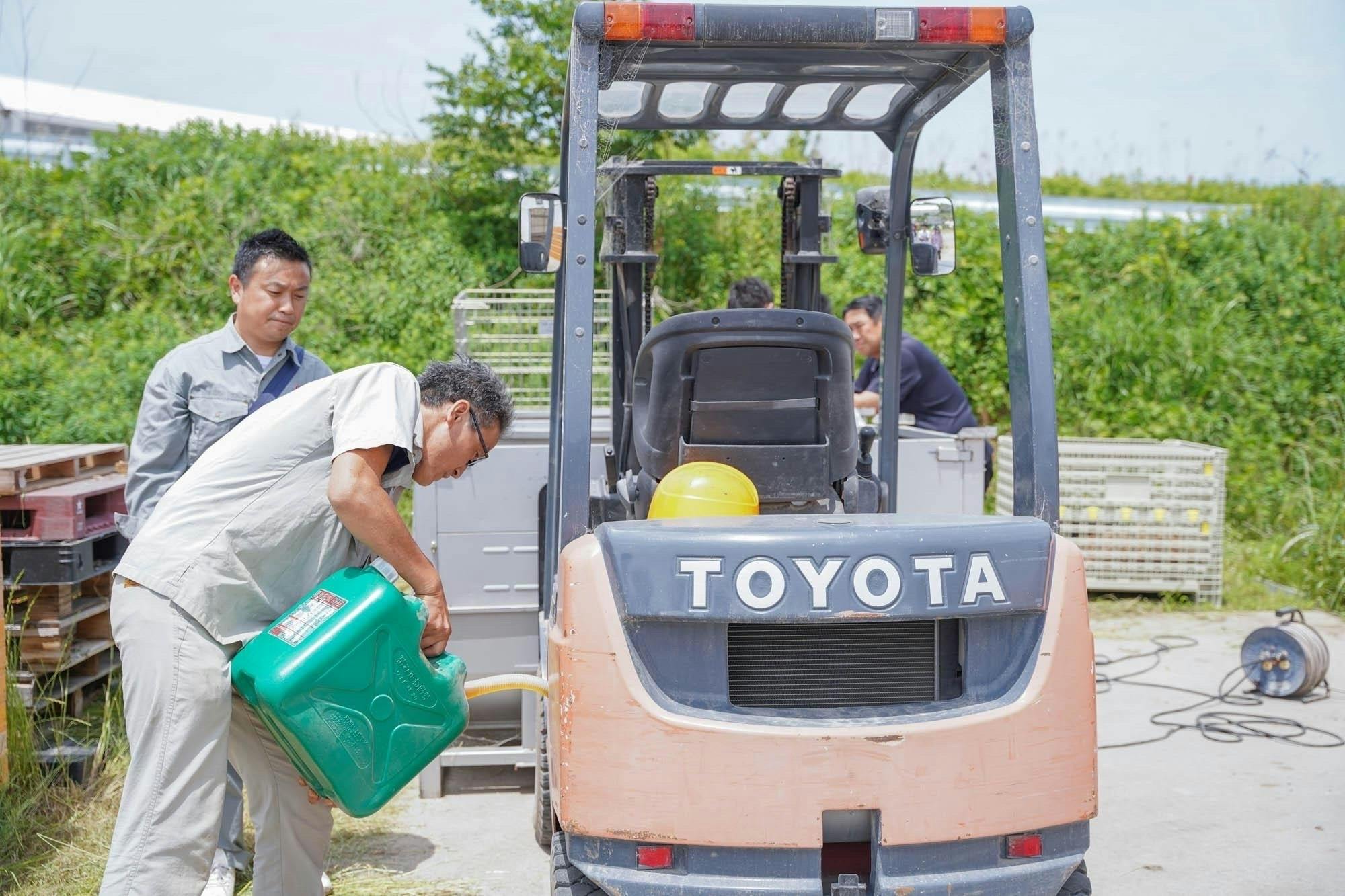 いよいよ、100%バイオ燃料を用いてフォークリフトを始動致しました!