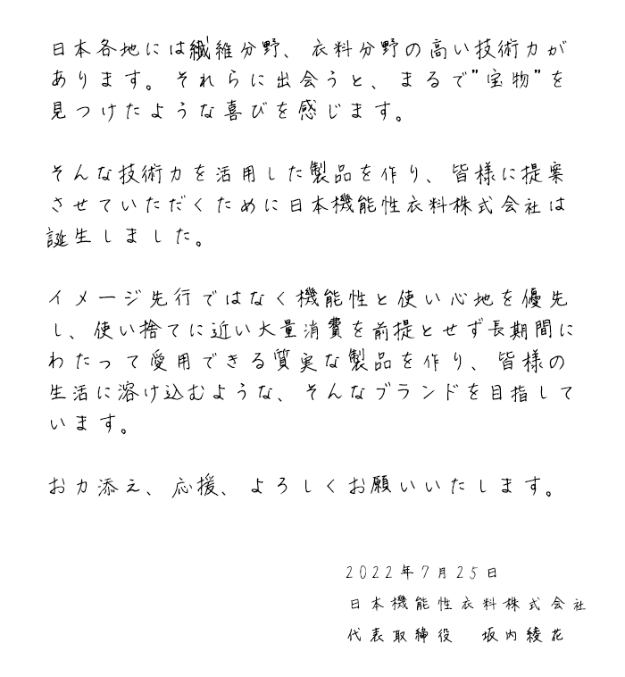 「B4a」を主宰するのは、日本機能性衣料株式会社 代表の坂内綾花です。ジャケットを日常を彩る重要なプロダクト(製品)として捉え直したとき、まだまだ新しいアイデアを注入し、日本国内の優れた技術によって実現させられるという可能性に気づきました。