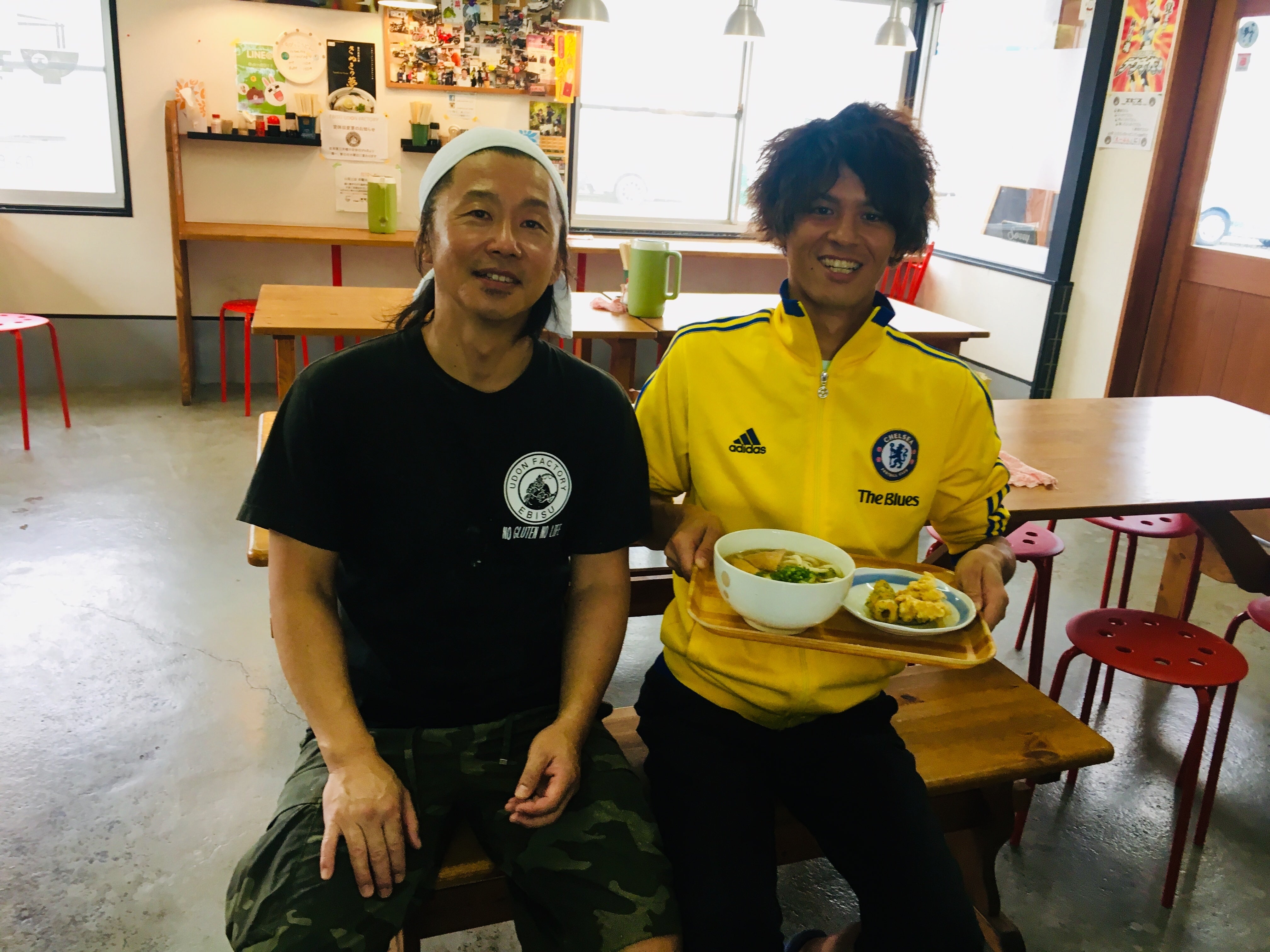 出演者に近づく子ども(1歳)とマイクを向けるメンバー。0歳から参加できるフェスとなる。出演アーティストやイベントスタッフのケータリングを担当してくれたエビスウドンファクトリーの店主である宮本さん(左)。イベントの為にコラボ限定うどんを作ってくれました。