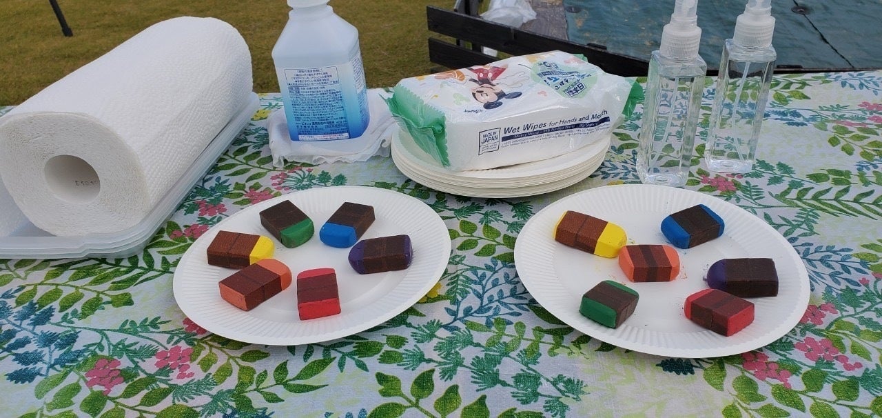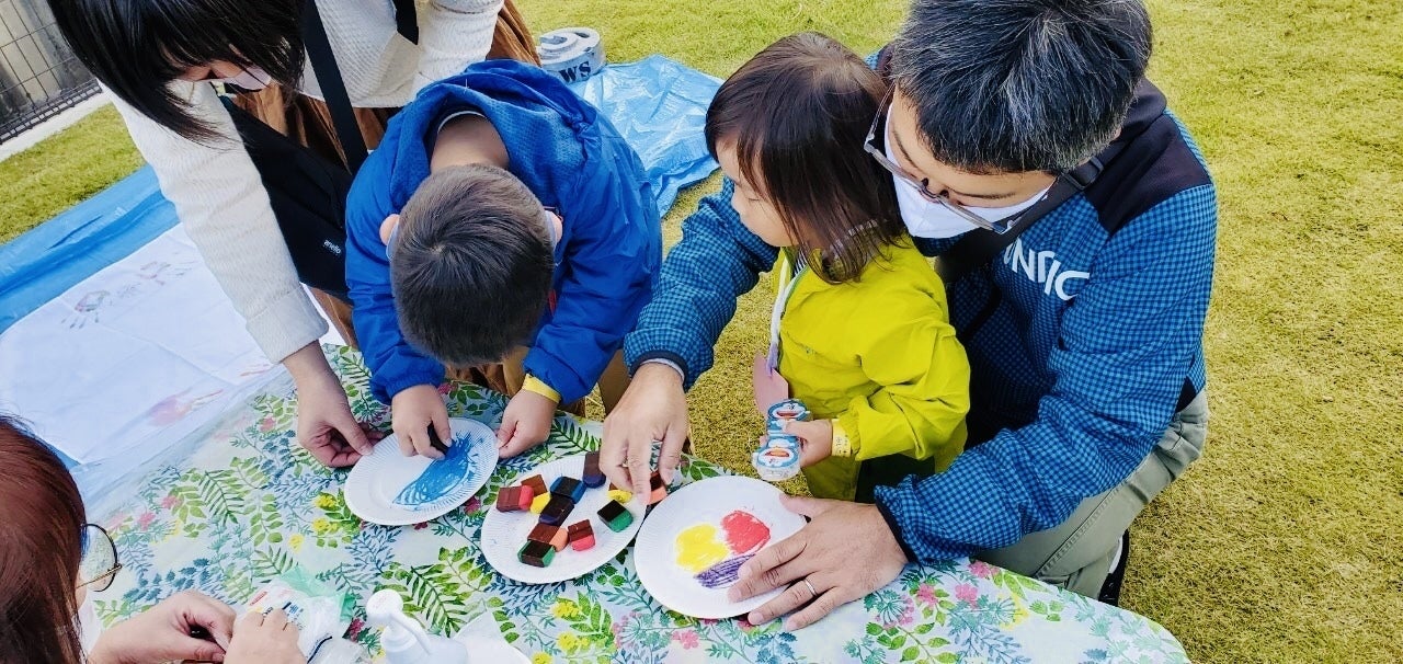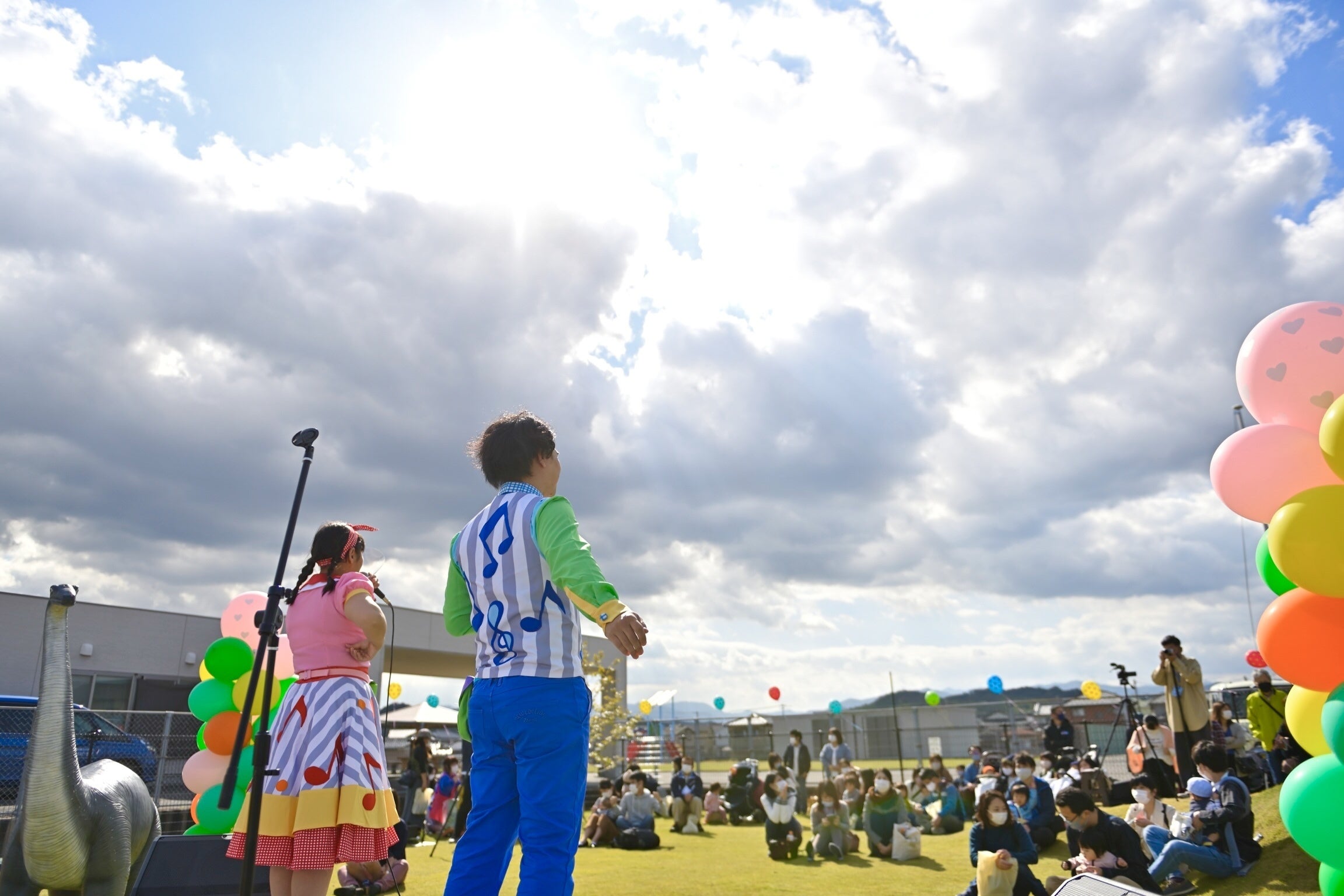 出演と同時に厚い雲から太陽の光がのぞかせる。苦しかったこの1年も報われたかのように出演者も参加者も笑顔となった瞬間です。キットパスを使って手形アートのブースを設けました。