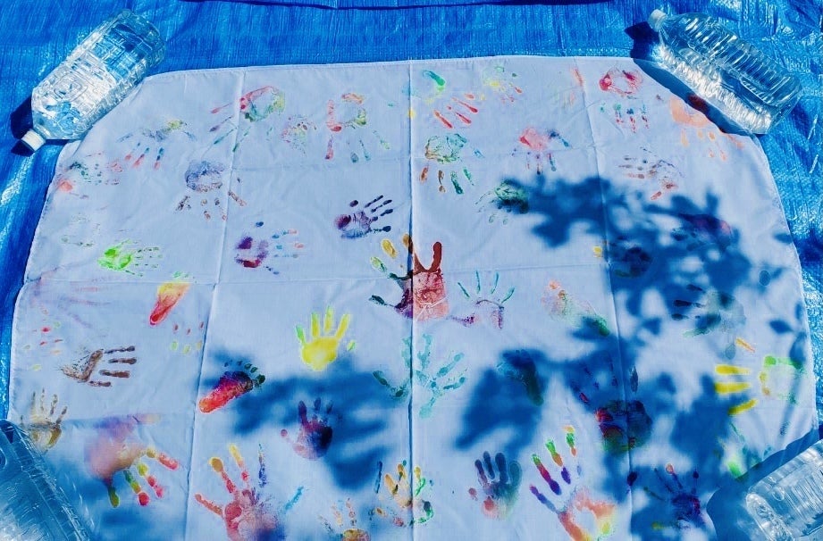 白いキャンパスにカラフルな手形アート2020参加者と一緒に作った思い出の作品となりました。