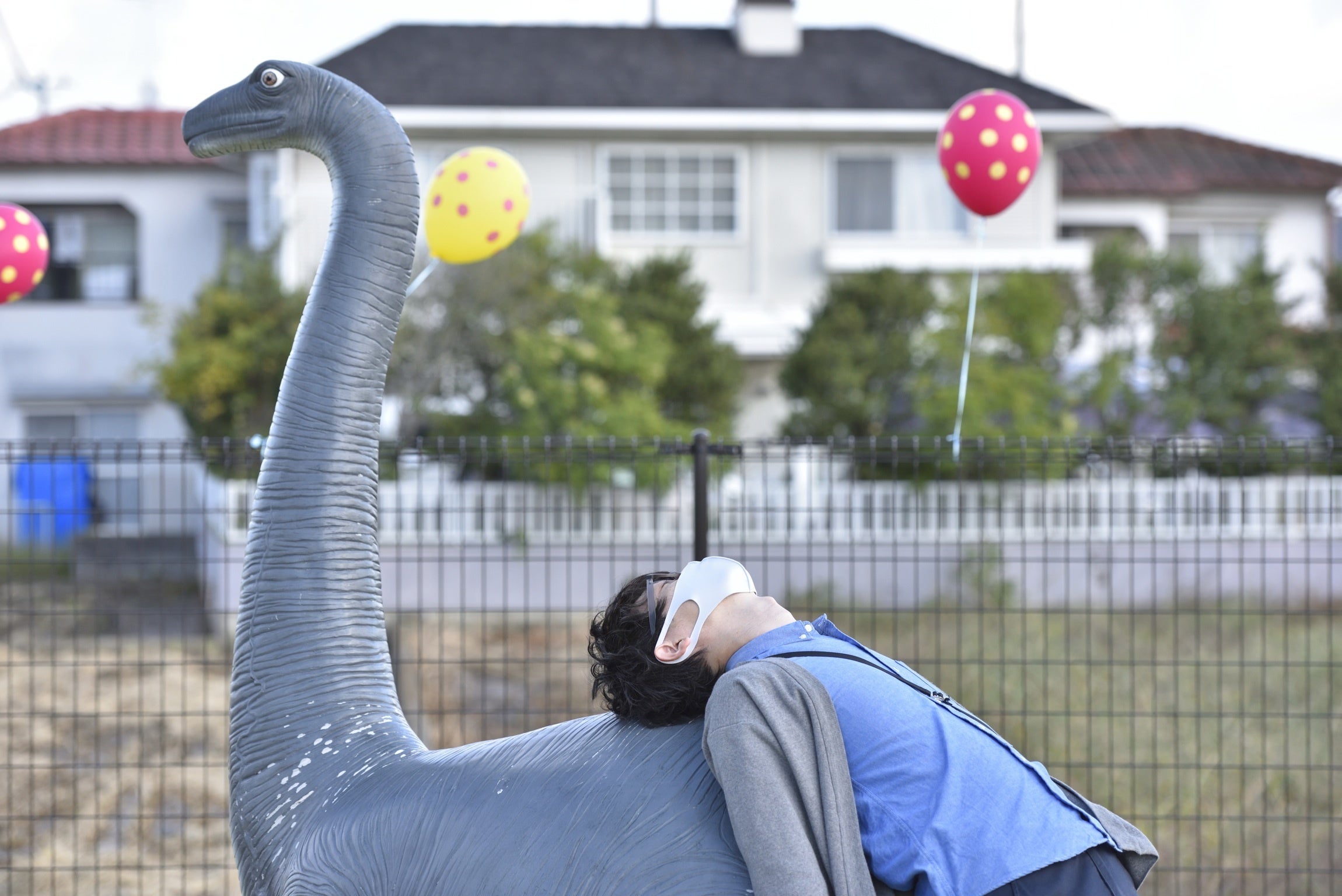 イベントの象徴ブロントサウルスに寄りかかりる出演者