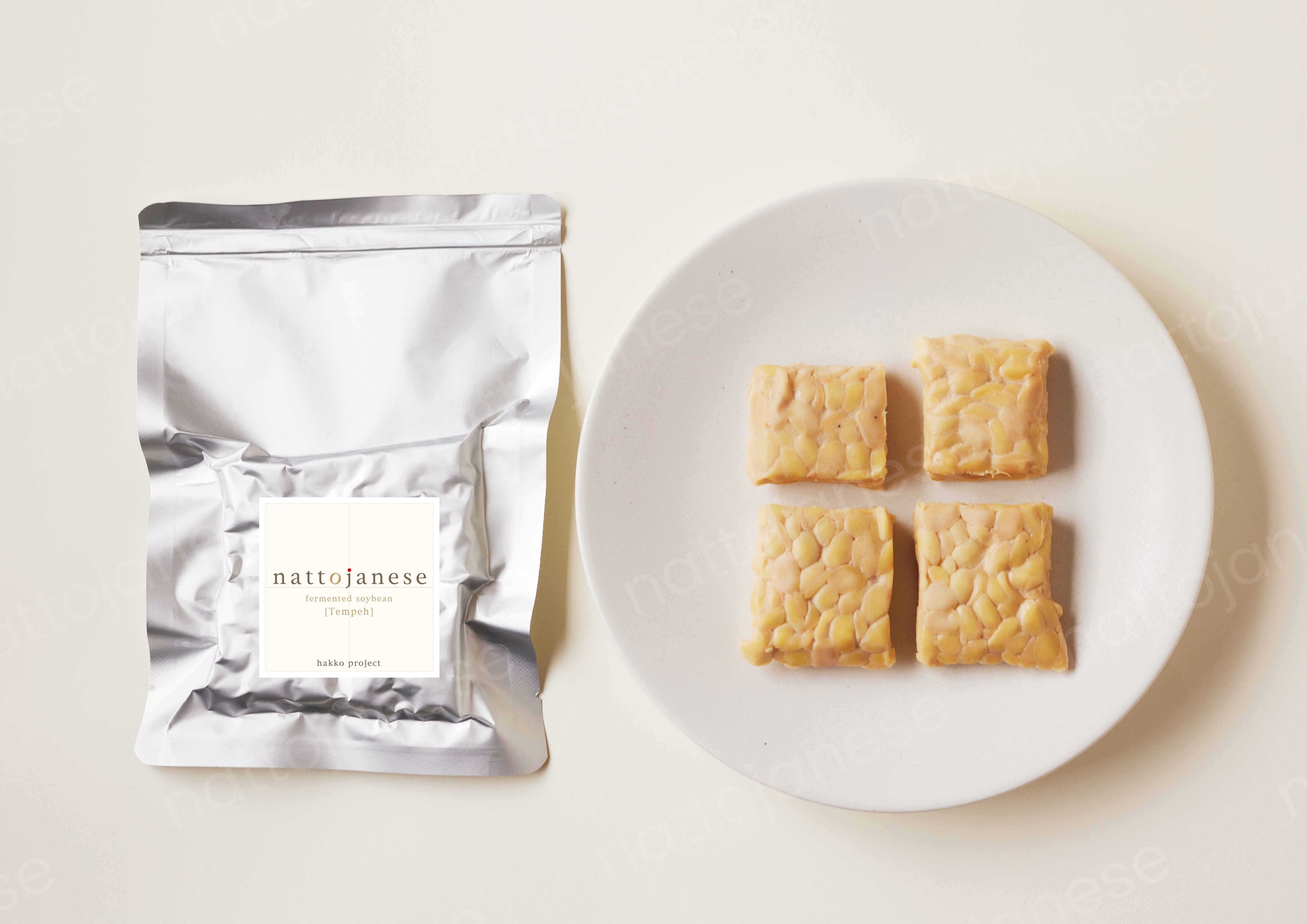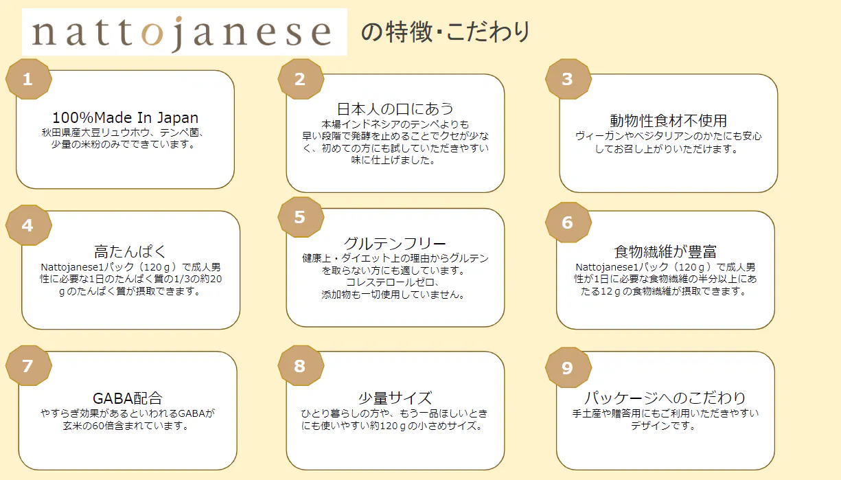 【こだわりその1】nattojaneseは、秋田県産大豆「リュウホウ」とテンペ菌、少量の米粉のみでできた100%Made in Japanのテンペです。安心安全な日本の食材とインドネシアの伝統的な製法で作られています。