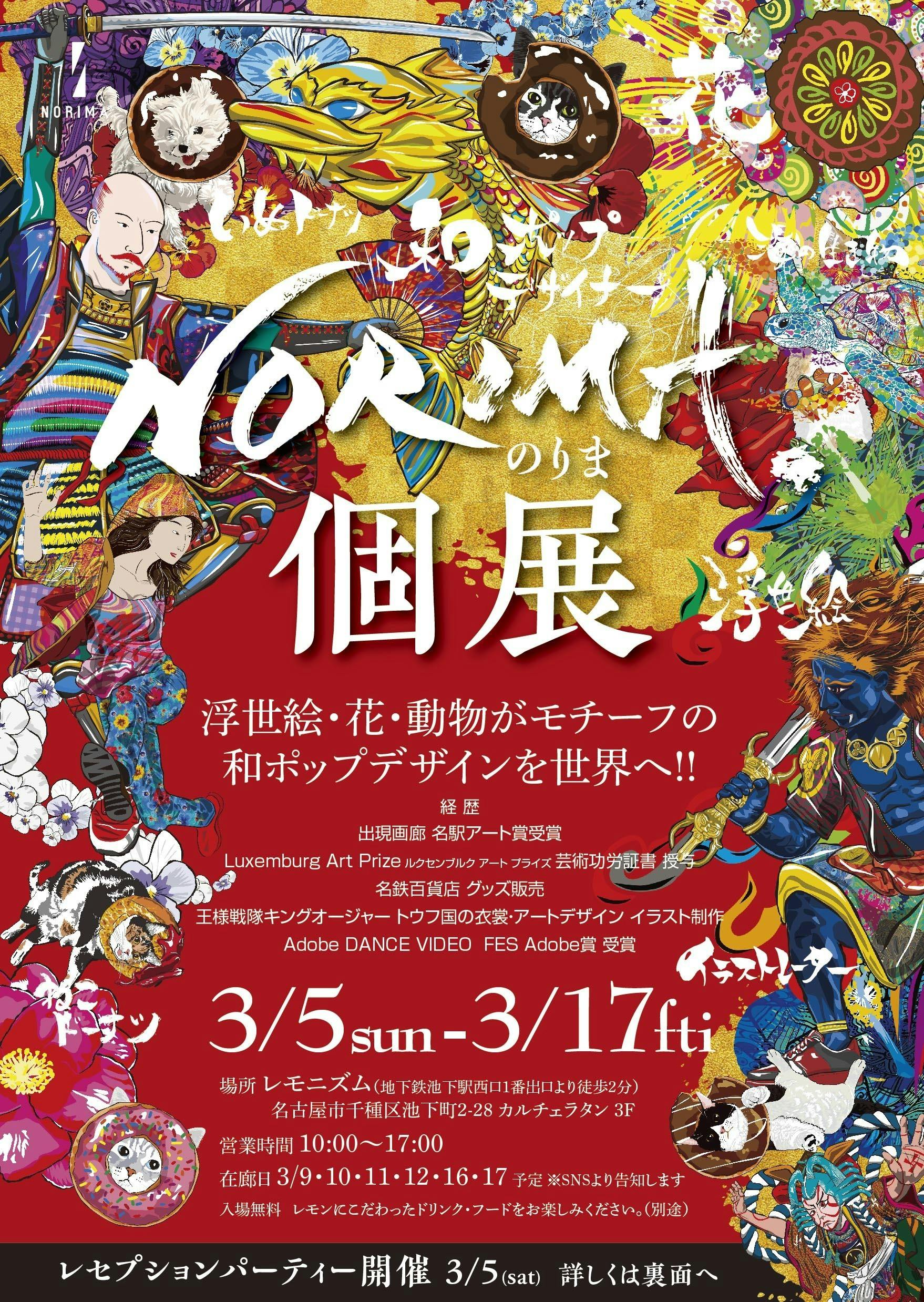 2023/02/22 00:05初個展開催さらに、3/5から始まる王様戦隊キングオージャーのトウフ王国に衣装や背景など、一部イラストが採用されました!!!3/5sun - 3/17fti場所 レモニズム(地下鉄池下駅西口1番出口より徒歩2分)知県名古屋市千種区池下町2-28 カルチェラタン 3F営業時間 10:00~17:00入場無料 レモンにこだわったドリンク・フードをお楽しみください。(別途)在廊日 3/9・10・11・12・16・17 予定 ※SNSより告知します———————————————————————Reception Party レセプションパーティー3/5(sun)受付 13:00- START 14:00-17:00Reception Party レセプションパーティー3/5(sun)受付 13:00- START 14:00-17:00個展限定 オリジナルカタログプレゼント!NORIMA.グッズもプレゼントしたいと思います入場料 ¥5500 人数になり次第終了▼▼▼お申込みフォーム▼▼▼https://docs.google.com/forms/d/e/1FAIpQLSc8b5_D65KGHKarl1sKfWRcz0LJSRVXzN4AHn0OzfQRBK4F_Q/viewform———————————————————————和ポップをテーマに、和柄の繊細さと、アメリカのグラフィティのようなポップで、カラフルなイラストを制作しています。 オリジナリティーとインパクトには定評があります。浮世絵風イラスト・花・動物ドーナツ・海の生き物をメインにシリーズ化しています。 AdobeIllustratorで制作。 マウスで描いて、一体描くのに2〜4週間かかり、細かく、繊細に作っています。日本の絵や文化の素晴らしさを再認識してもらい、世界にアピール中!!浮世絵・花・動物がモチーフの和ポップデザインを世界へ!!経歴中京テレビ 出現画廊 名駅アート賞受賞Luxemburg Art Prize ルクセンブルク アート プライズ 芸術功労証書 授与名鉄百貨店 グッズ販売王様戦隊キングオージャー トウフ国の衣裳・アートデザイン イラスト制作 Adobe DANCE VIDEO FES Adobe賞 受賞グラフィックデザイナー / イラストレーター2000年 デザイン会社入社 2006年 フリーランスで独立 以降現役 2021年 イラストレター活動を開始・NORIMA.商標登録 1つ目・Tシャツ販売など ECサイト立ち上げ ・海外でTシャツが売れる2022年 クリエイターズEXPO参加 デザインフェスタやクリエイターズマケット出展 NORIMA.商標登録 2つ目 中京テレビ主催 出現画廊 名駅アート賞受賞 名鉄百貨店 グッズ販売2023年 Luxemburg Art Prize 芸術功労証書 授与王様戦隊キングオージャー トウフ国の衣裳・アートデザイン イラスト制作今後予定日本の伝統文化とのコラボ ポケットポートを開発中!!姫路にて個展開催予定 インバウンドに乗っかり、和ポップのイラストを活かす場所を探したい もっと見る