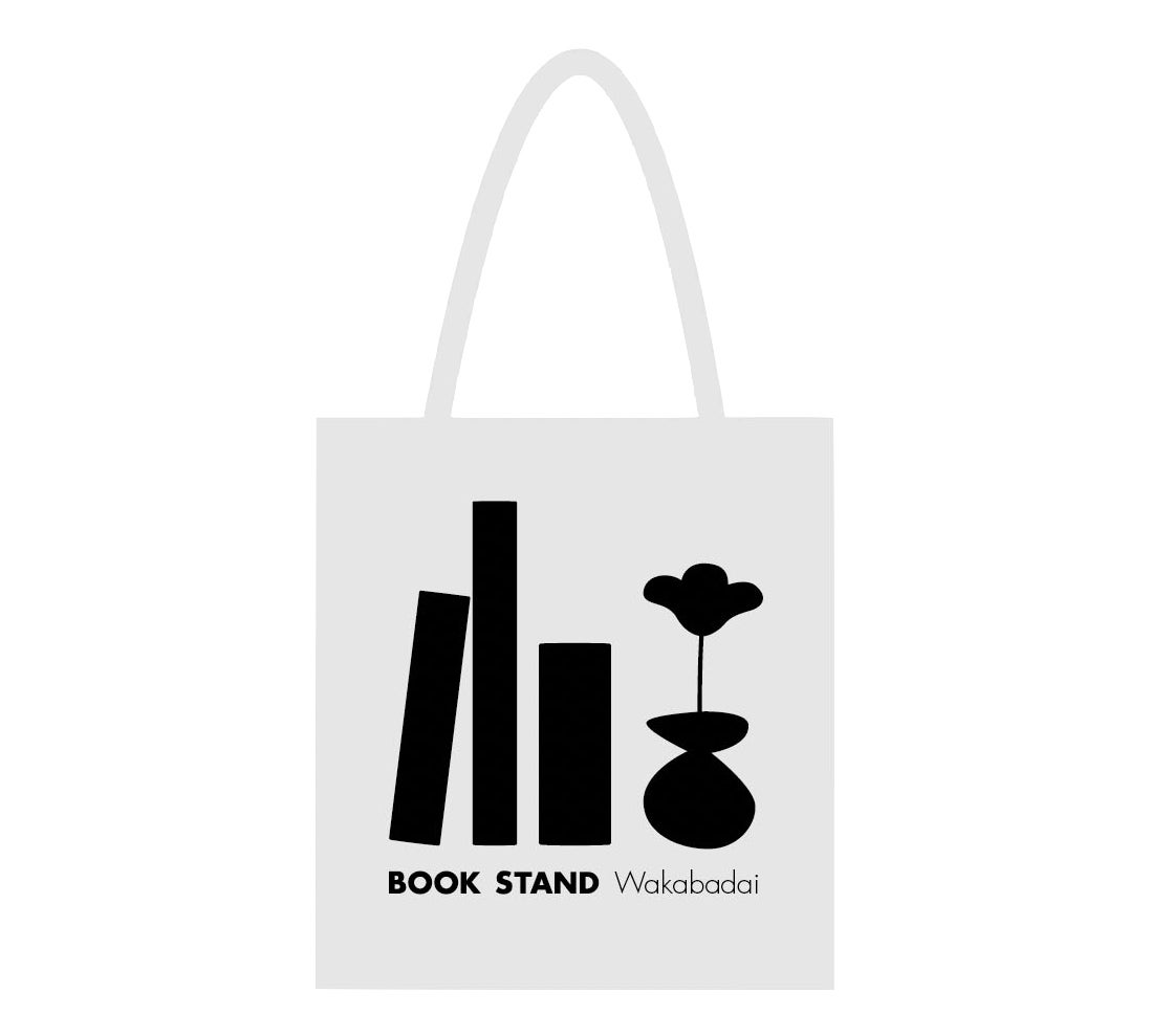 グレーのボディにBOOK STAND 若葉台のロゴをシルクスクリーンでプリントした薄手のオリジナルトートバッグです。リサイクルコットンを使用しているので環境に優しく、小さく折りたたんで、くるっと紐でとめることもできます!