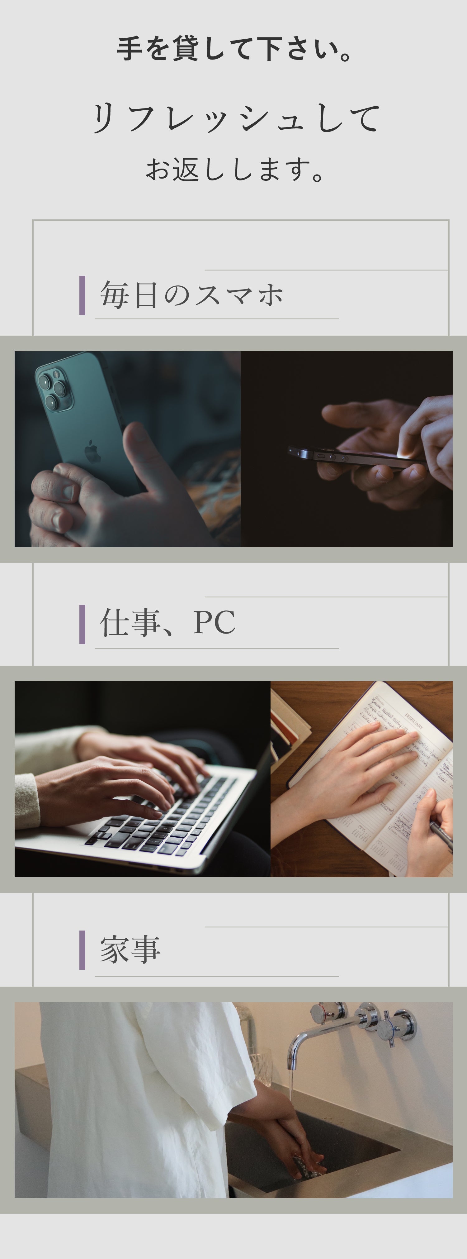 スマホやPC、仕事や家事や趣味。毎日必ず手を使っています。