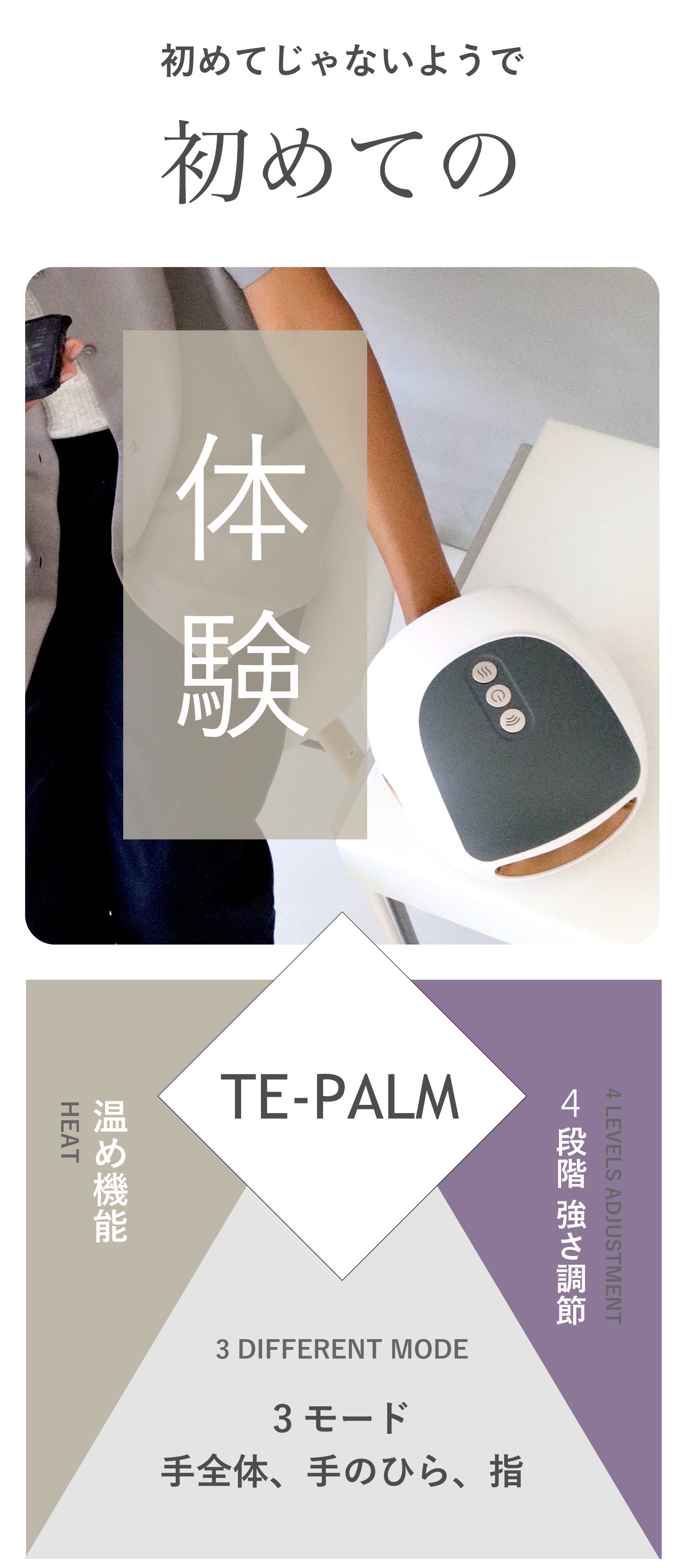 調節のできるエアープレスやじんわりと温める温め機能で毎日ケアができる環境。毎日頑張る貴方の手にそんなひと時をお送りさせていただくためにTE-PALMの制作に着手いたしました。