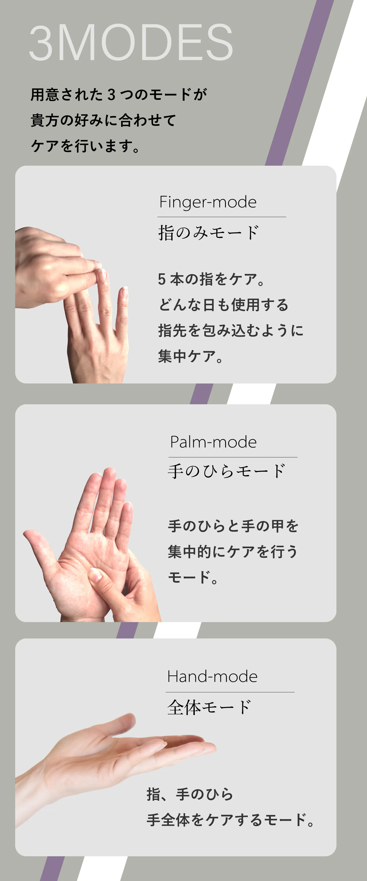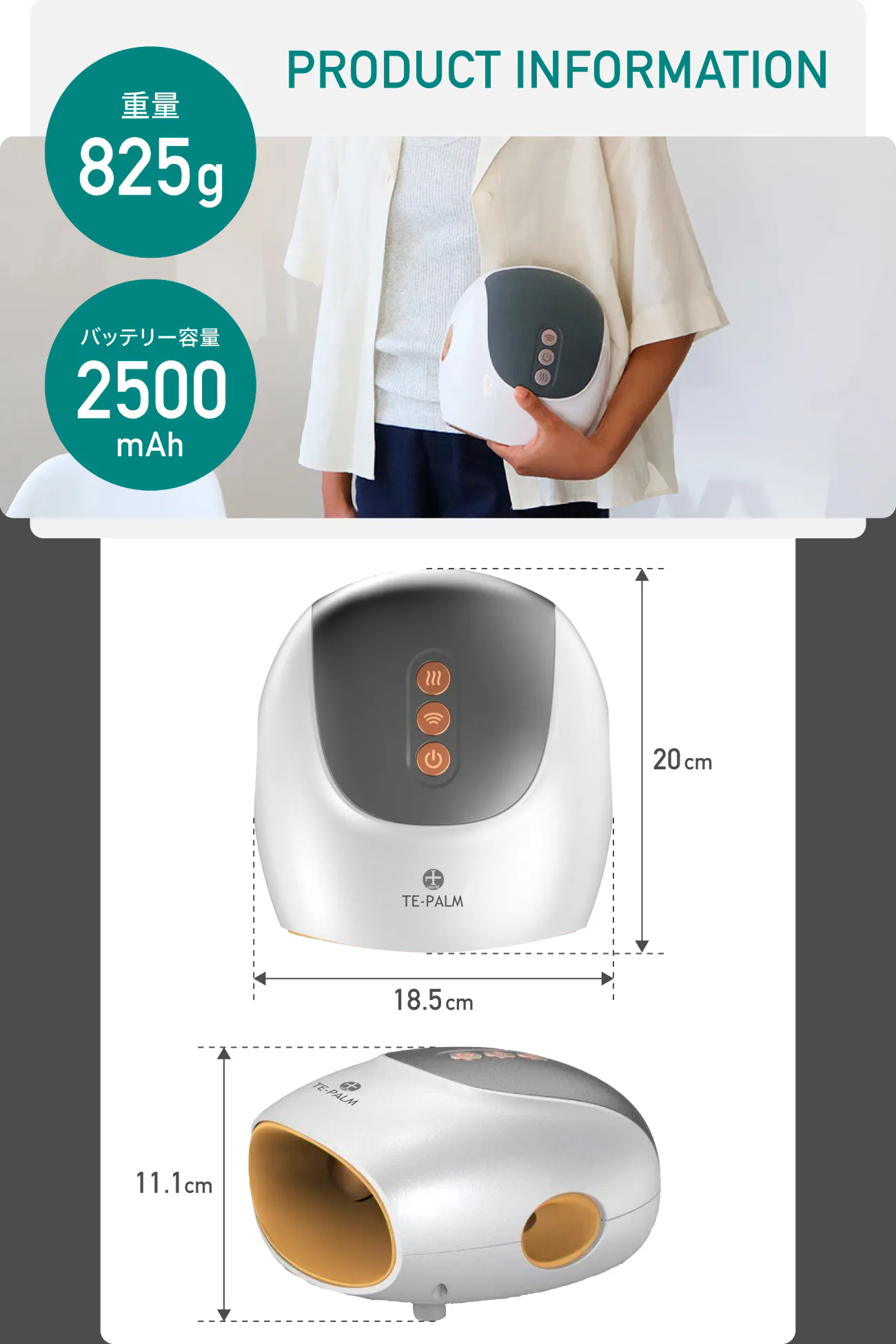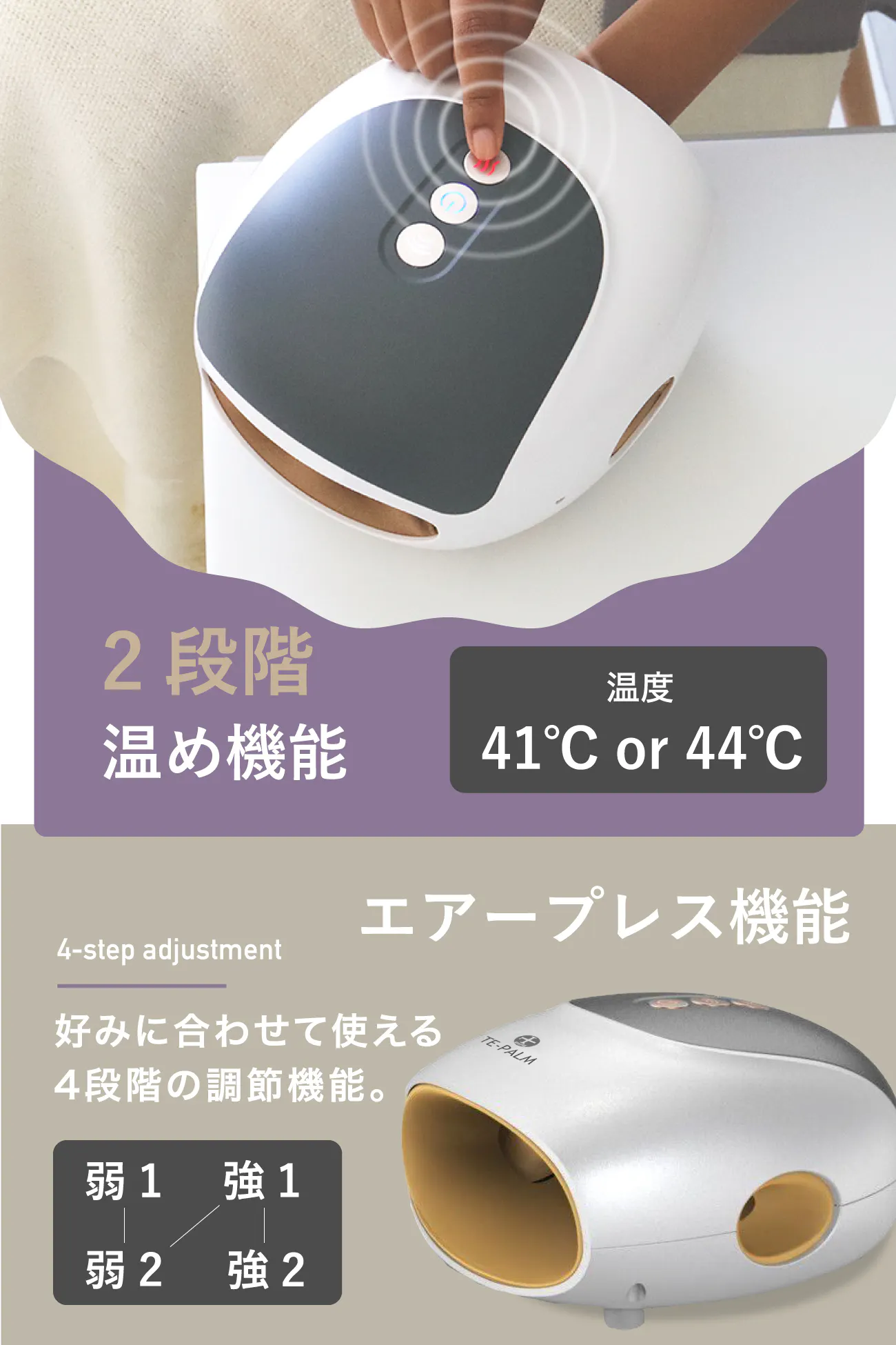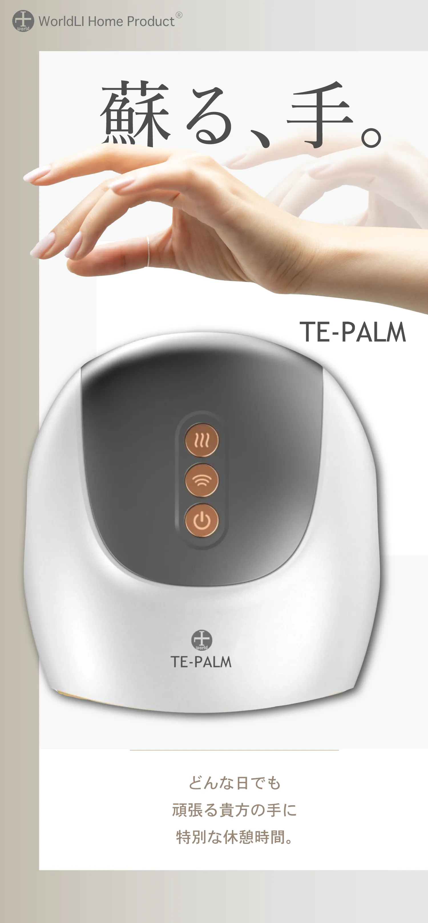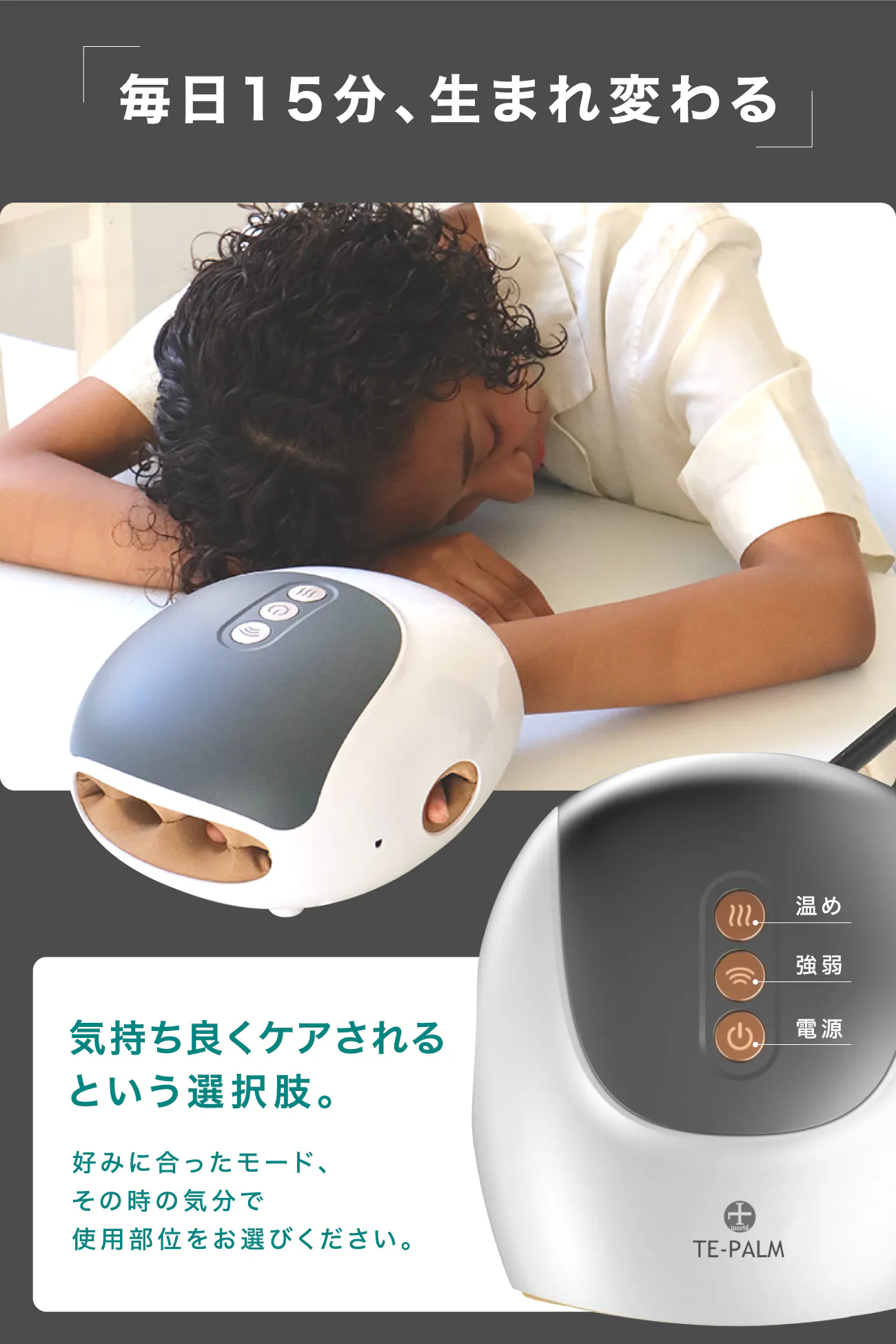 調節のできるエアープレスやじんわりと温める温め機能で毎日ケアができる環境。毎日頑張る貴方の手にそんなひと時をお送りさせていただくためにTE-PALMの制作に着手いたしました。