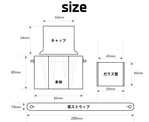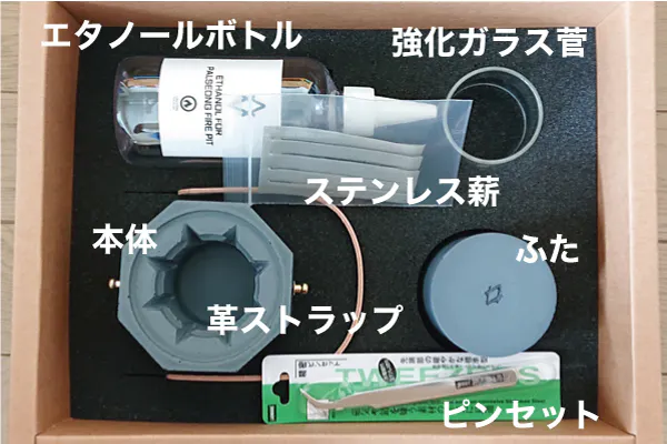 【セット内容】:火炉本体、耐熱ガラス管、蓋、革ベルト、ステンレス製薪、ピンセット、エタノール容器(中身は入っておりません)、取扱説明書(日本語表記)