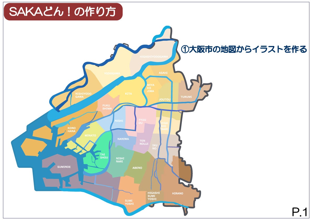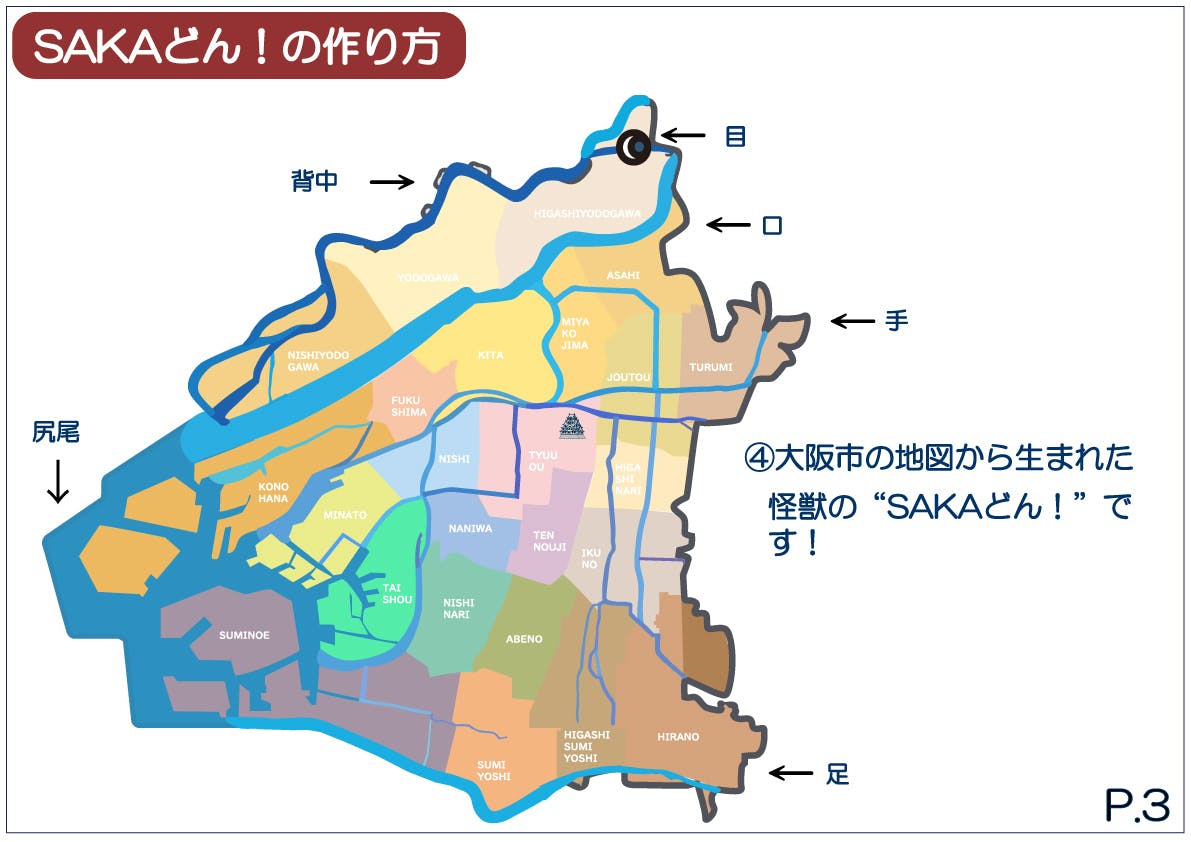 大阪市の地図が見方によっては怪獣にも見える?・・・ので、大阪の"さか"をとって"SAKAどん"というキャラクターにデザインしてイラストにしました。サブキャラクターとして大阪市を横断する最も大きな淀川の"YODOちゃん"も作りました。
