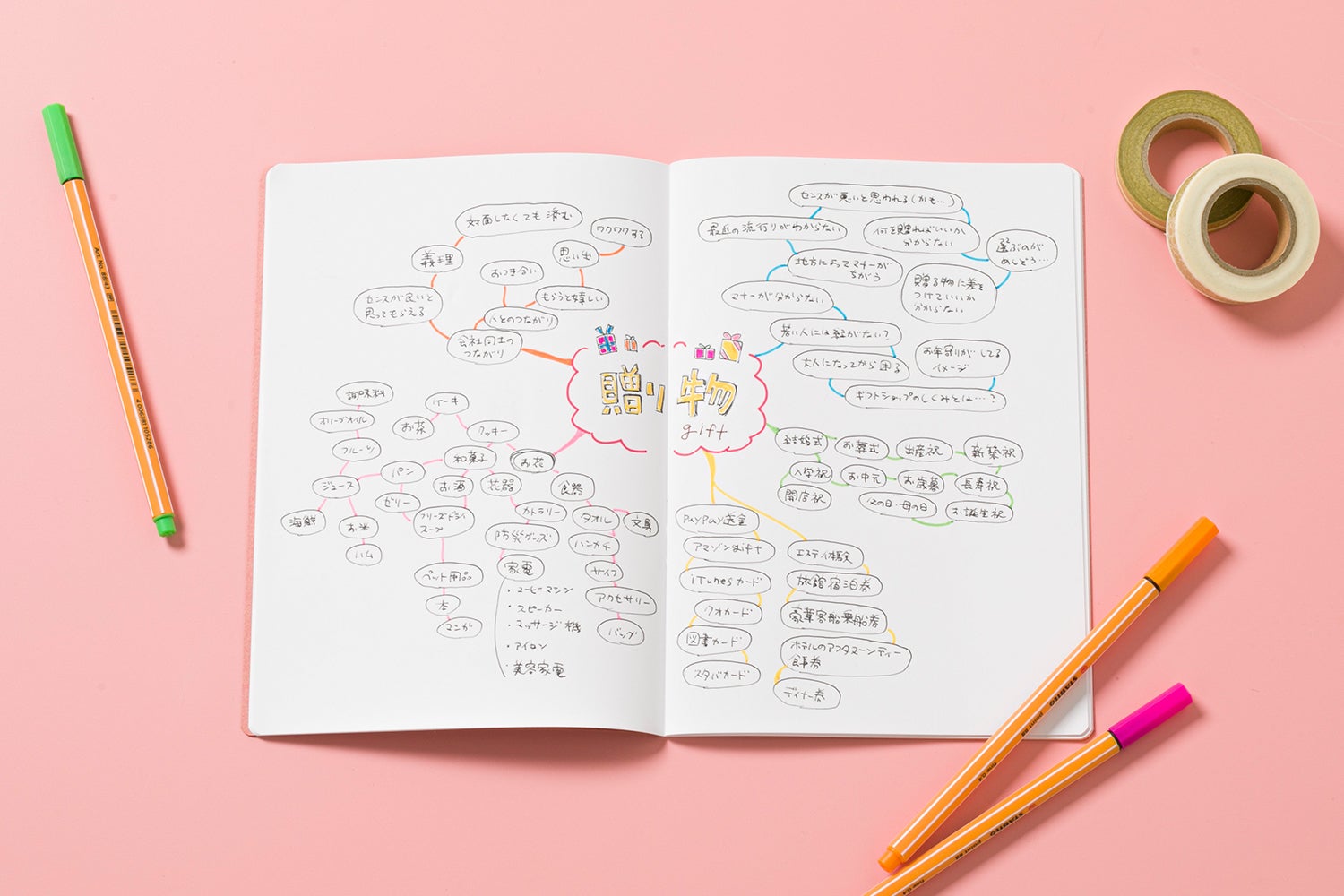デザイナーのアイデアノート。課題キーワードから、思いつくワードやイメージを線で繋ぐように広げていく。