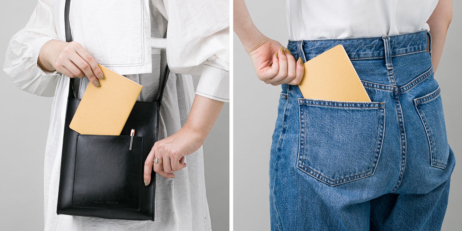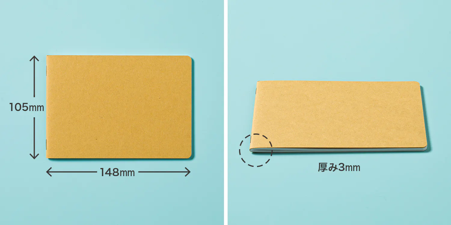 ポケットや小さいバッグに入るコンパクトなA6サイズ。ひらめいたアイデアを、いつでも小さなノートに。取り出す時の引っかかりを少なくするため、ノートは角丸仕様です。