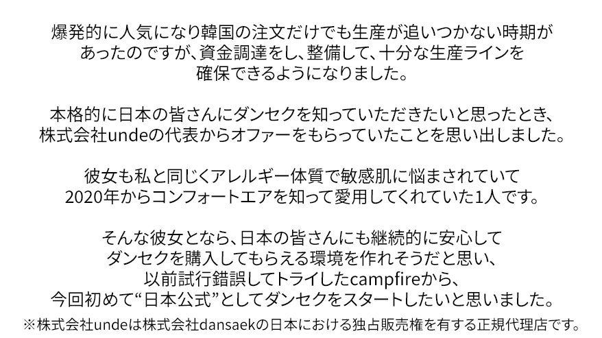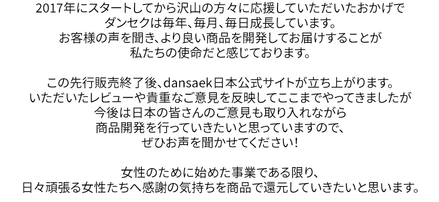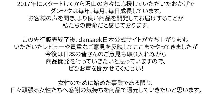 2023/01/17 13:26この度は、ダンセクを応援いただき本当にありがとうございました。皆様のおかげで開始3日目で目標金額を達成し、最終的に目標額162%を超えることができました。重ねてお礼申し上げます。皆様の多大なるご支援を糧に、今後も女性のライフスタイルを支える様々な製品を開発することに努めてまいります。発送は1/19(水)〜を予定しております。当初の予定より遅くなり大変申し訳ございません。もうしばらくお待ちいただけますと幸いです。ダンセクは、敏感肌で辛い思いをしていたお母さんが娘のために作った吸水ショーツです。皆様の大事なご家族で初めて”あの日”を迎える娘さんや、敏感肌で悩んでいる方、多忙な日々をお過ごしの方、”あの日”に悩むすべての女性たちに安心してお使いいただけますように。今後もどうぞよろしくお願いします。インスタグラムもやっておりますので、使用方法など気になることがございましたら、お気軽にご連絡くださいませ。■インスタグラムhttps://instagram.com/dansaek_jp■メールinfo@unde.co.jp もっと見る