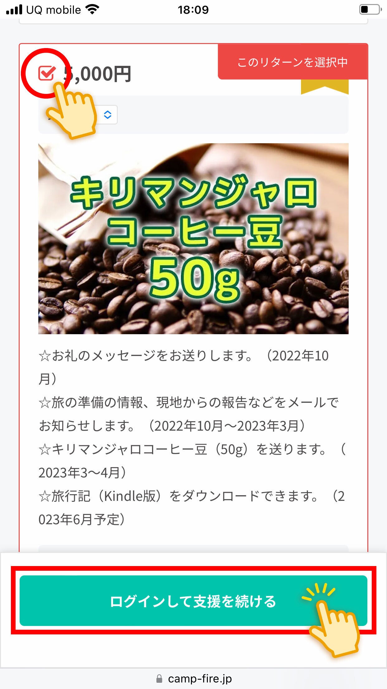 ②リターンを選択し、[ログインして支援を続ける]をタップします。