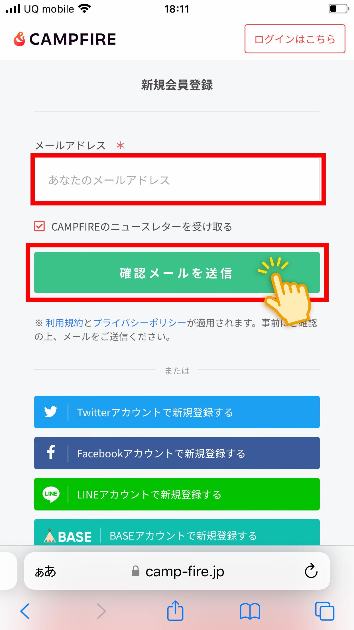 ④メールアドレスを入力して、[確認メールを送信]をタップします。