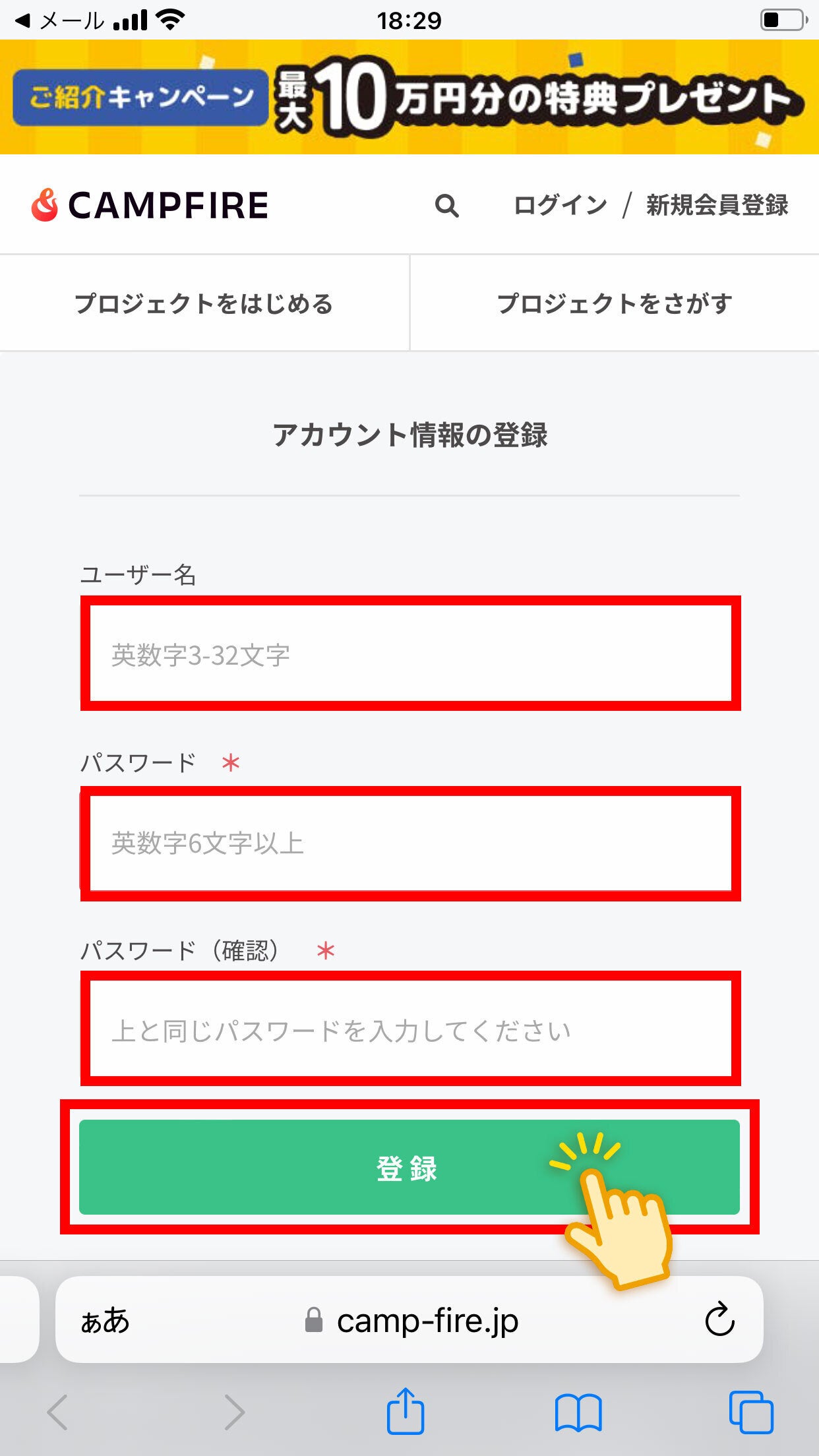 ⑥ユーザー名、パスワード、パスワード(確認)を入力して、[登録]をタップします。