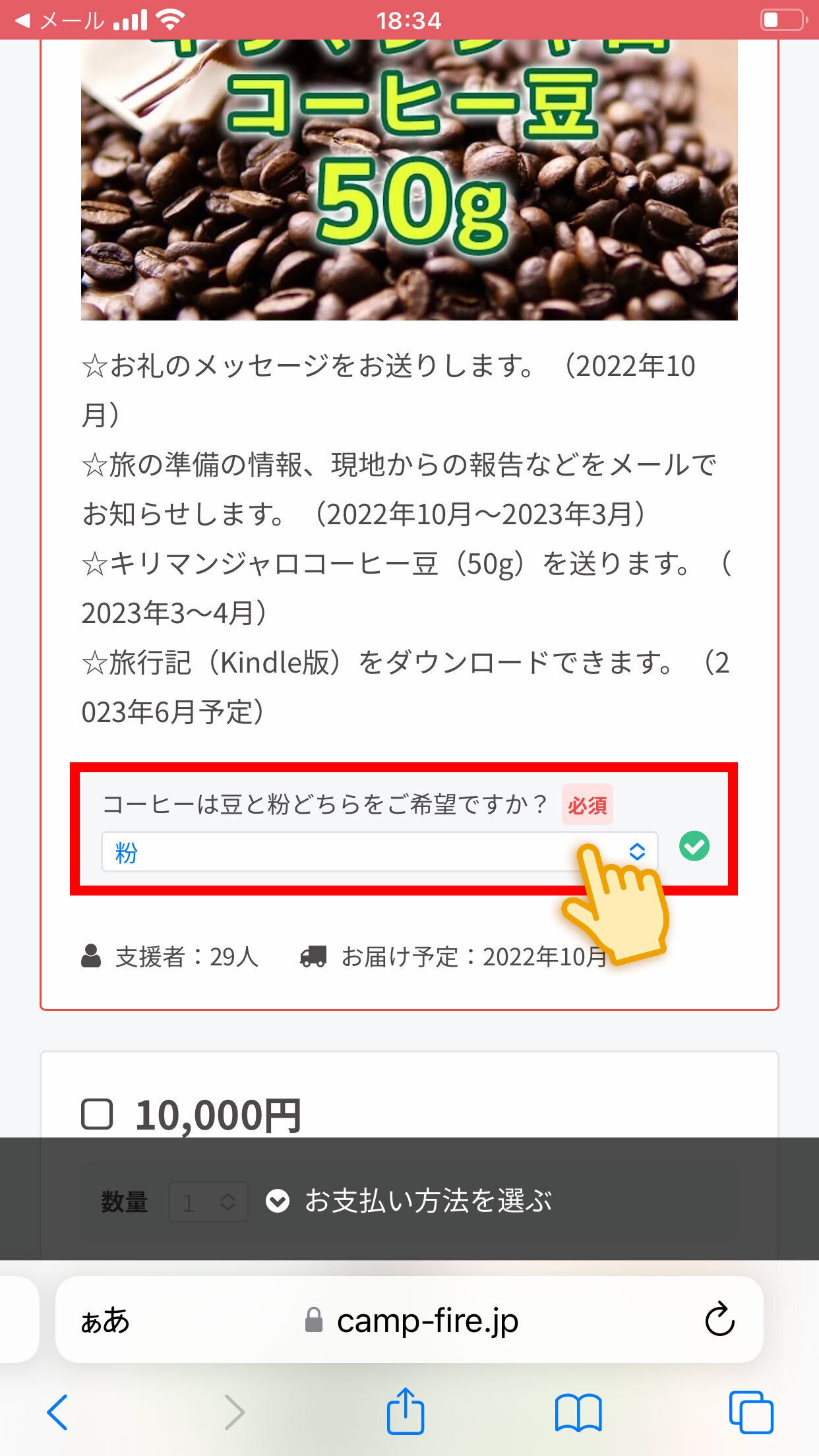 5,000円以上のご支援の場合は、「コーヒーは豆と粉どちらをご希望ですか?」のところで、豆か粉かを選択してください。