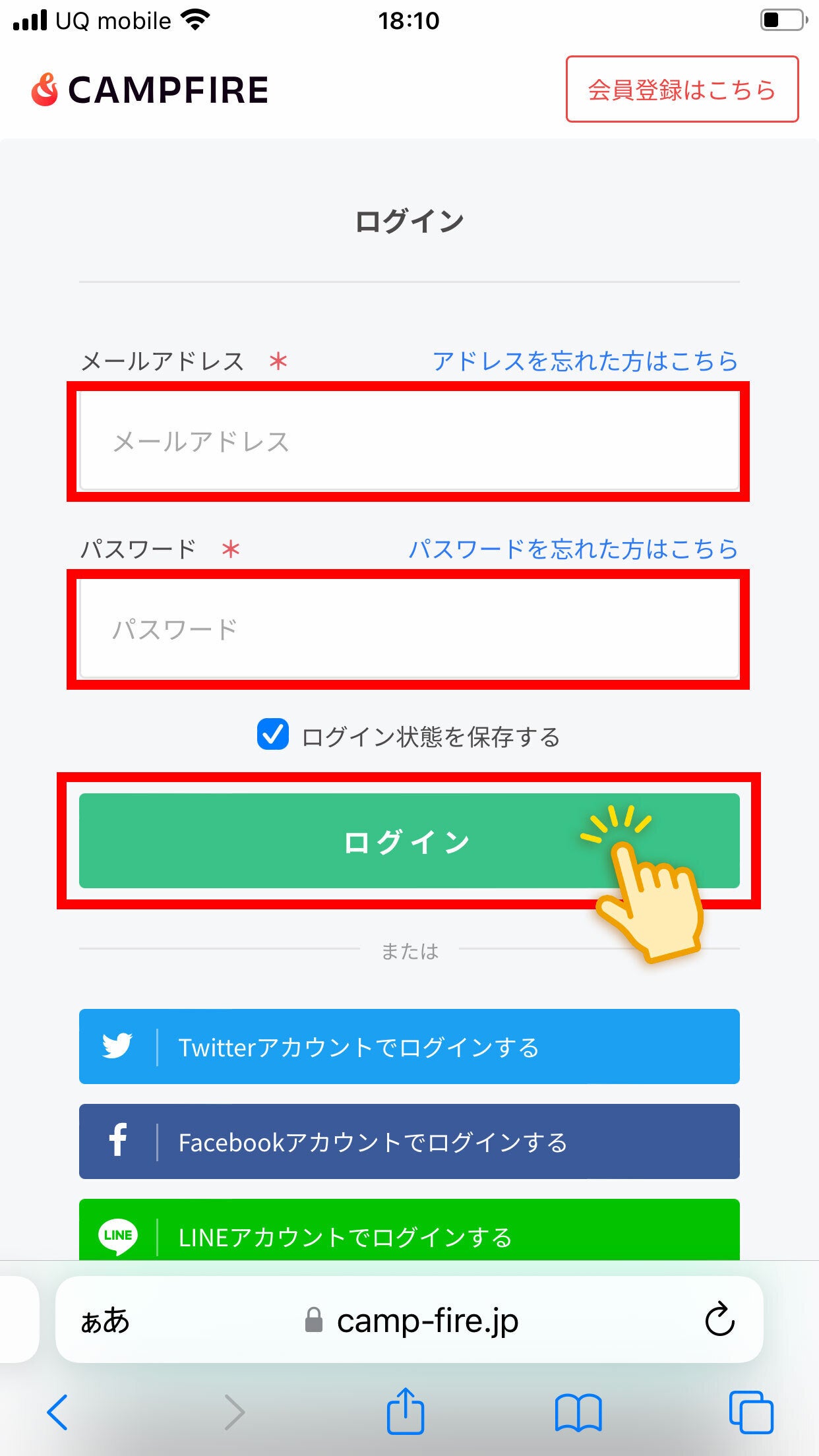 ⑦メールアドレスとパスワードを入力して、[ログイン]をタップします。