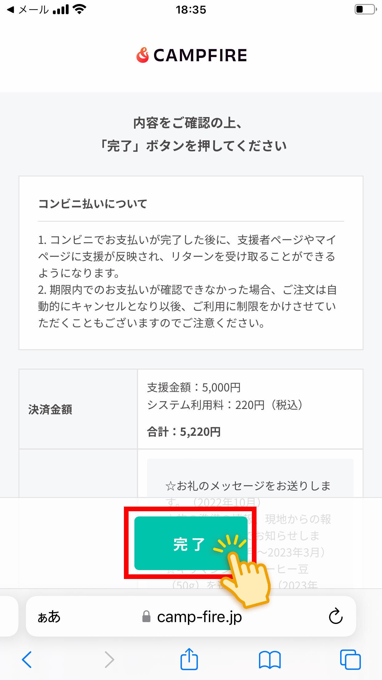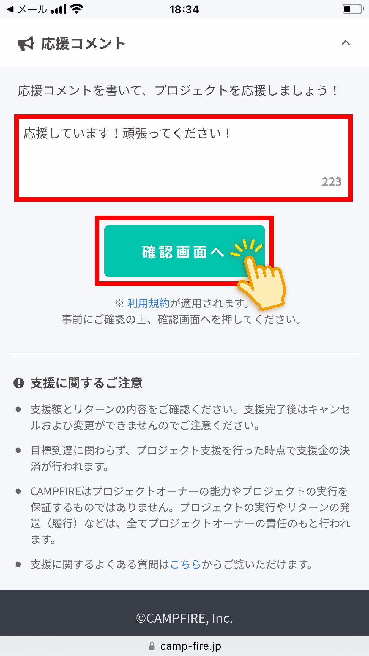 ⑫応援コメントを入力し(任意)、[確認画面へ]をタップします。