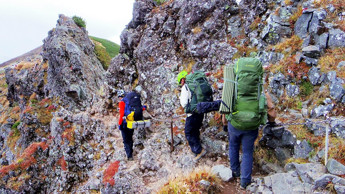 岩場を歩く登山者