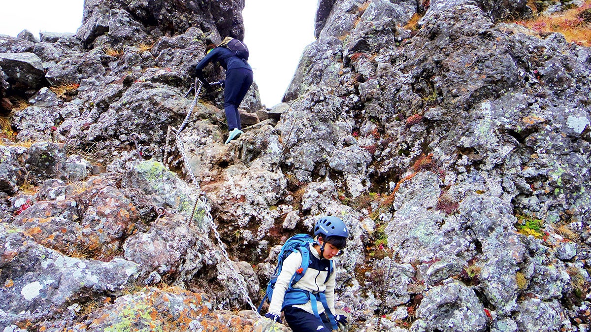 険しいところには鎖が張られていて、片手で鎖を掴み、もう片方の手で岩を掴んで登っていきます。これを鎖場(くさりば)と言います。