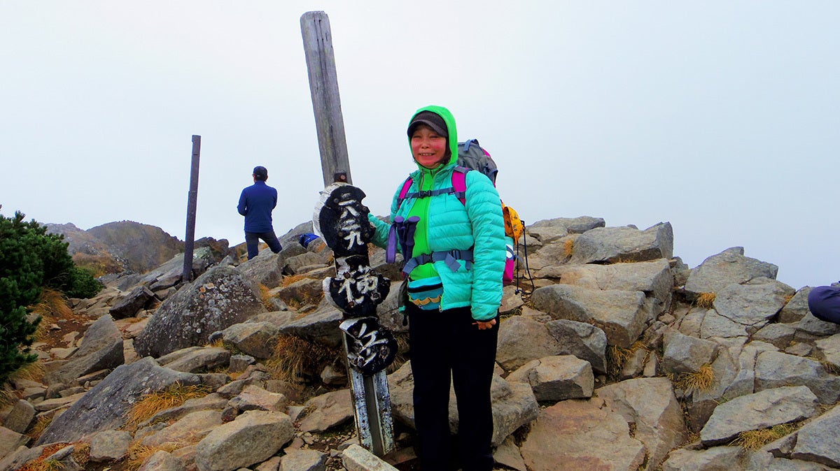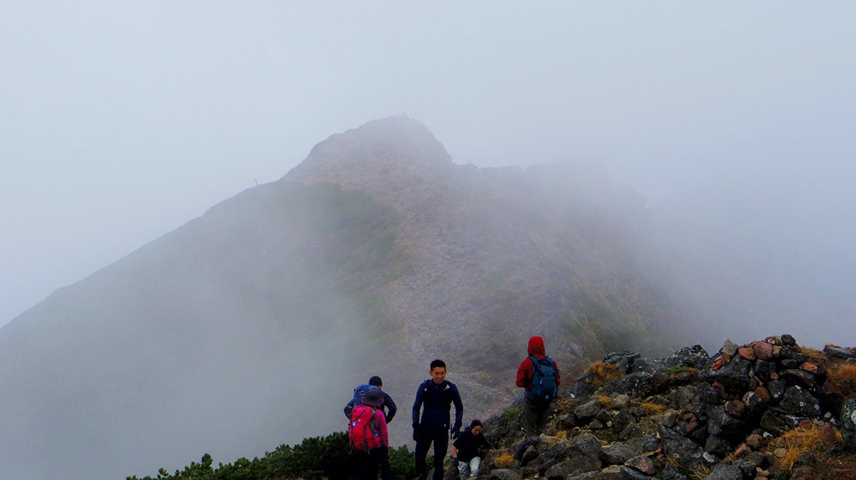 濡れて、滑る、冷たい鎖を必死に握りしめ、冷たい雨に打たれながら、なんとか赤岳を登りきりました。