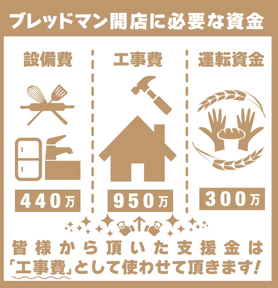 内装や外装費、修繕費がかかり、銀行からの融資と、自己資金を合わせても足りなく、支援のご協力をお願いせざる得なくなりました。