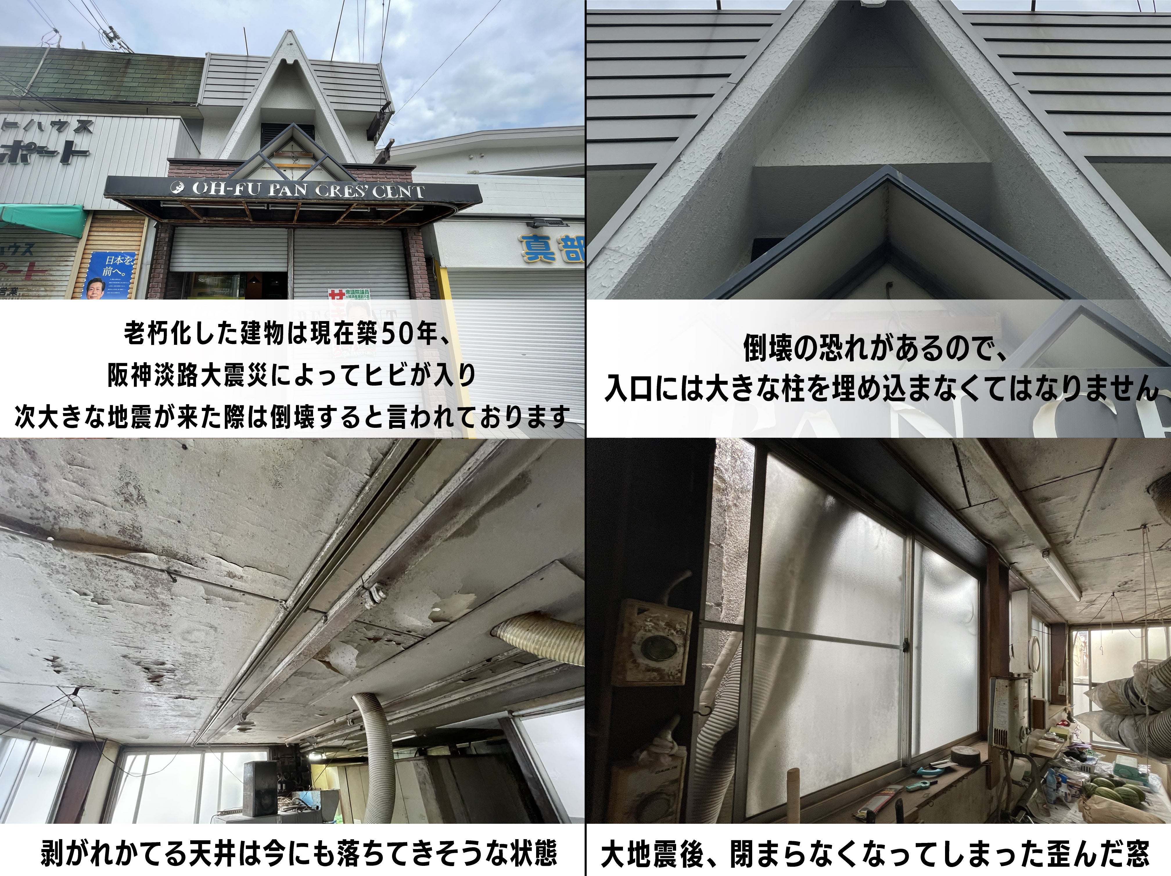 阪神淡路大震災によってヒビが入り、次大きな地震が来た際は倒壊すると言われており、入口には大きな柱を埋め込まなくてはなりません。