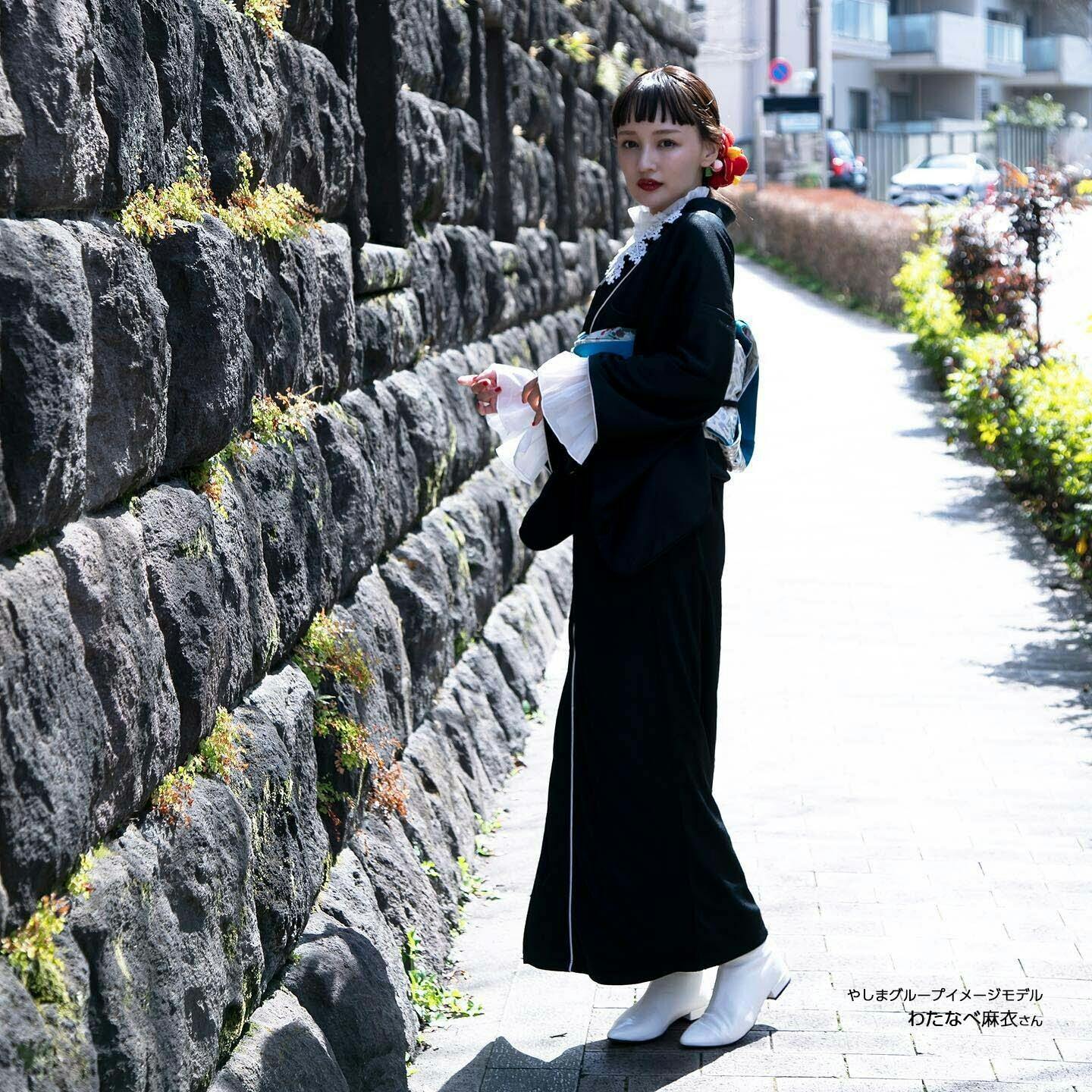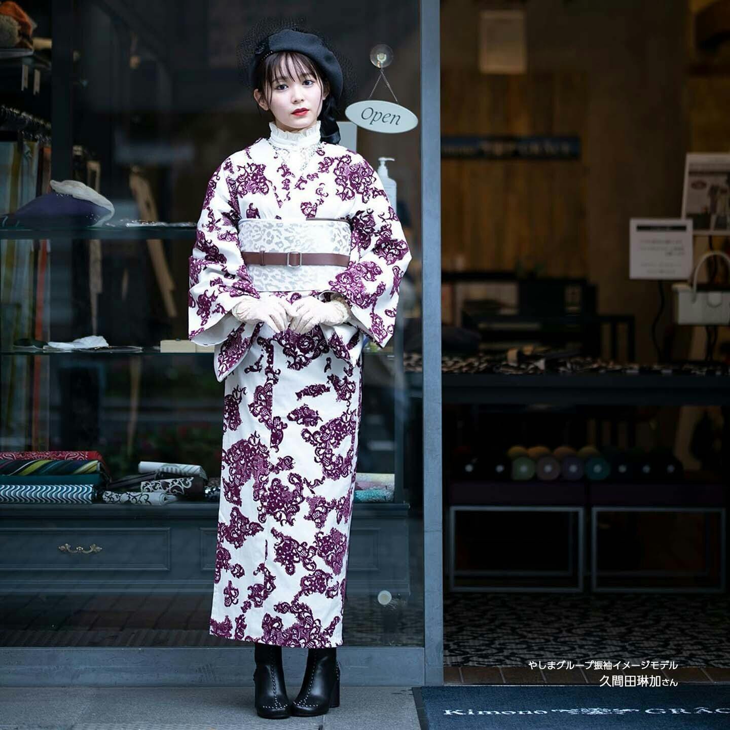 ふつうの着物のように着こなしても、帯のかわりにベルトをしめたり、インナーにシャツやフーディーを合わせたり、レースの衿をつけてもかわいい!