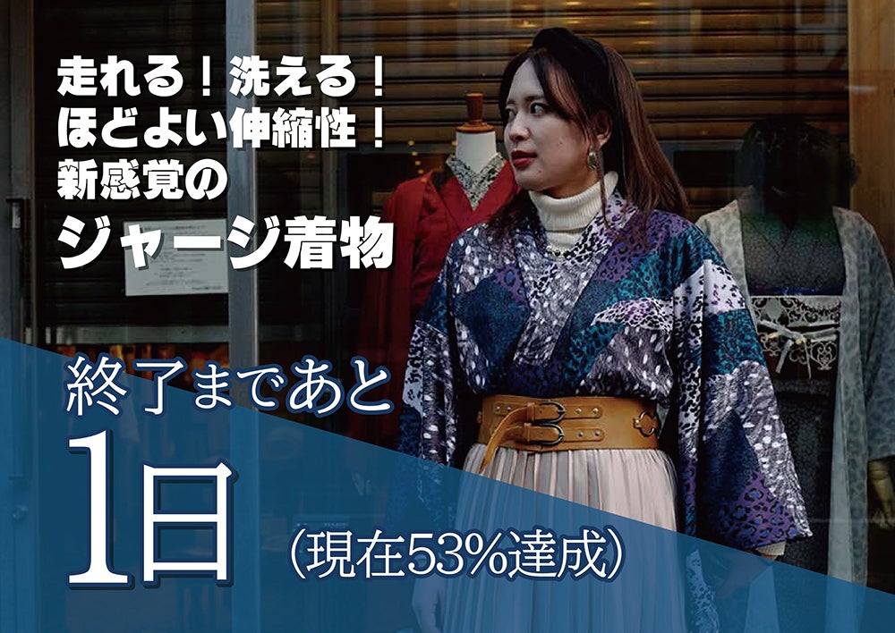 こんにちは!キモノグラースです。「走れる!洗える!ほどよい伸縮性!新感覚のジャージ着物」プロジェクトを応援いただきありがとうございます。皆様からの暖かいご支援により、ここのところ伸び悩んではおりますが、達成率53%まできています。心より感謝御礼を申し上げます。いよいよあと1日になりました!もう、本当に本当にあと1日です…残り1日で100%達成を目指すため、ぜひぜひ!プロジェクトページをSNSなどでシェアしていただければと思います。https://camp-fire.jp/projects/view/610716【ご支援の締め切りは10月30日23時59分までです】人気ブランドさんとコラボした、キモノグラースにしかないジャージ着物が1万円OFFで手に入るのも、あと1日だけです!レディースフリーサイズとメンズMサイズ、メンズLサイズがあります。「こんな素敵な着物が欲しかった!!!」と思って頂ける方の目に留まりますように…。どうぞご協力お願い致します。