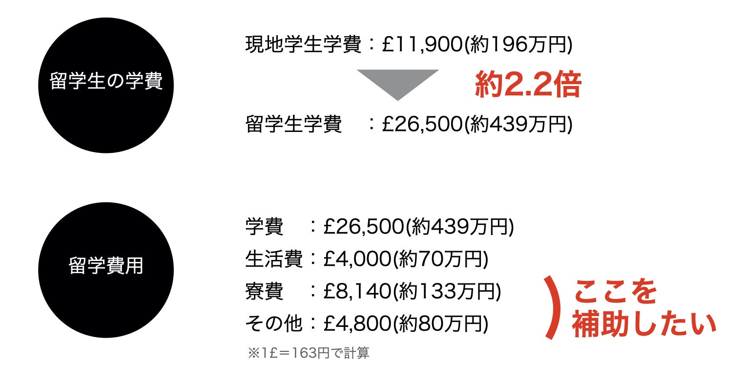 イギリスの大学でかかる学費は留学生の場合、現地学生より約2~3倍の学費を支払う必要があると言われています。さらに寮費や生活費が発生するため支払う金額は莫大です。また、勉強に集中するためにはバイトなどの両立は難しいと知り合いのイギリス大学院卒業生から伺っているため、奨学金の応募も含め資金調達を行なっています。実際に、学費の一部が免除される奨学金付きの合格を大学からはいただいていますが、それでも自費で全留学費用を賄うのは円安の影響も含め現状では難しい状況です。