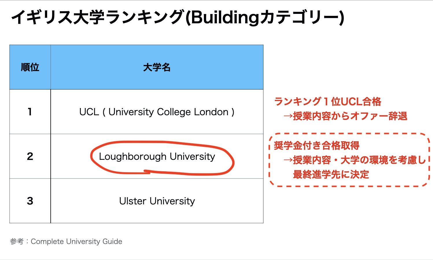 大学の実績として、イギリス国内の大学ランキングでBuilding(建設)というカテゴリーでは1位がUCL(University College London)、2位がLoughborough Universityとなっています。1位のUCLからも合格を頂きましたが、こちらの大学は学術研究寄りのコースを提供しています。実践的なスキルを身につけたいという自分の想いや、大学の留学生に対するサポート体制、生活環境などを総合的に判断しLoughborough Universityへの進学を決意しました。