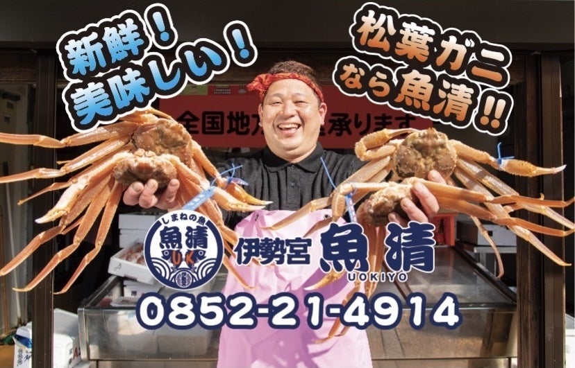 「松江市伊勢宮で魚屋一筋52年!島根県産にこだわり山陰沖、日本海の芳醇な海の幸を二代目魚清社長が確かな目で厳選し、旬の魚・カニを、新鮮なままお届けいたします。」
