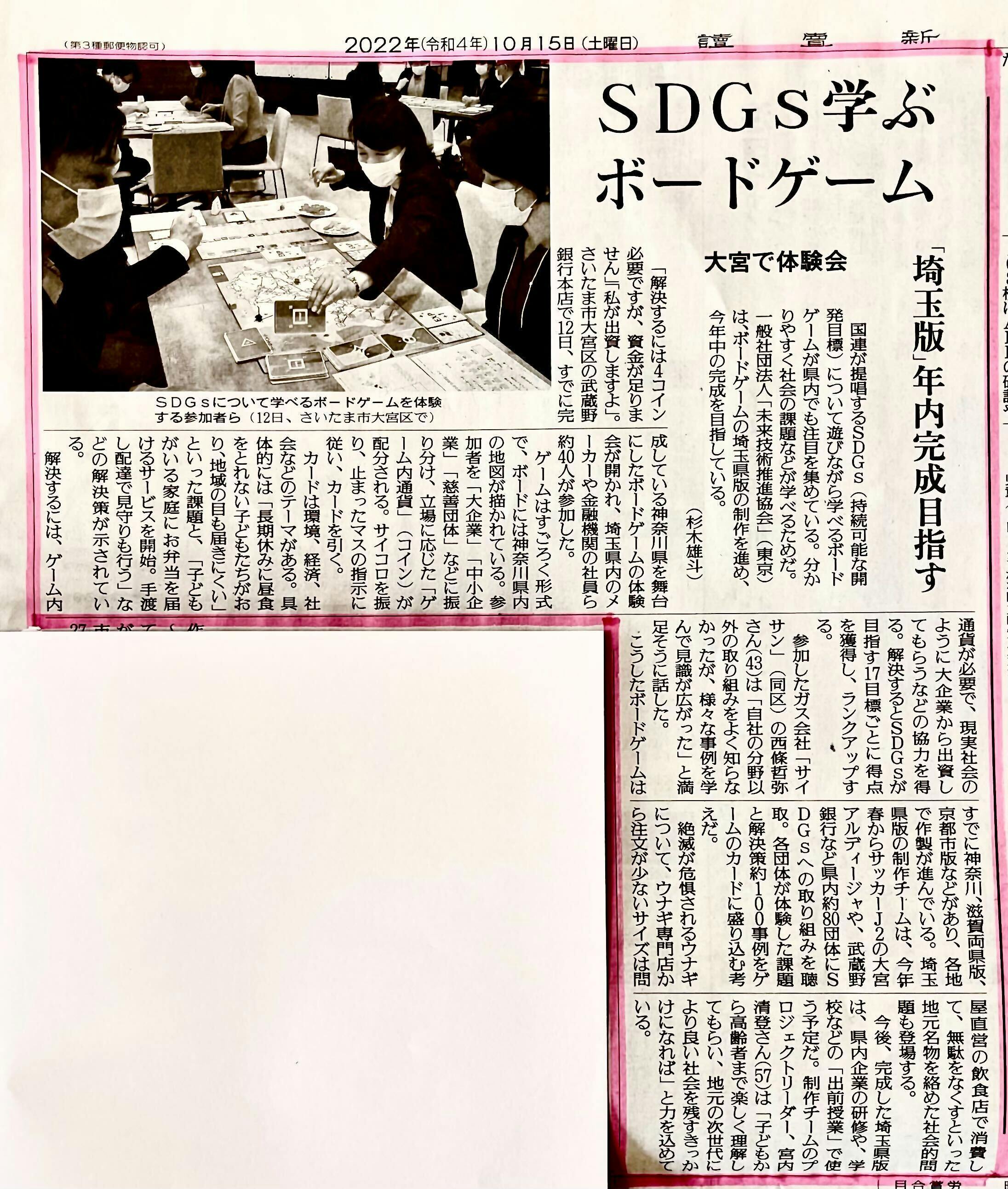 先日10/12に開催した「SDGsボードゲーム体験会&交流会」のイベントに関して、10/15発売の全国紙の読売新聞の埼玉(県東・県南)紙面のp24に大きく掲載していただきました!