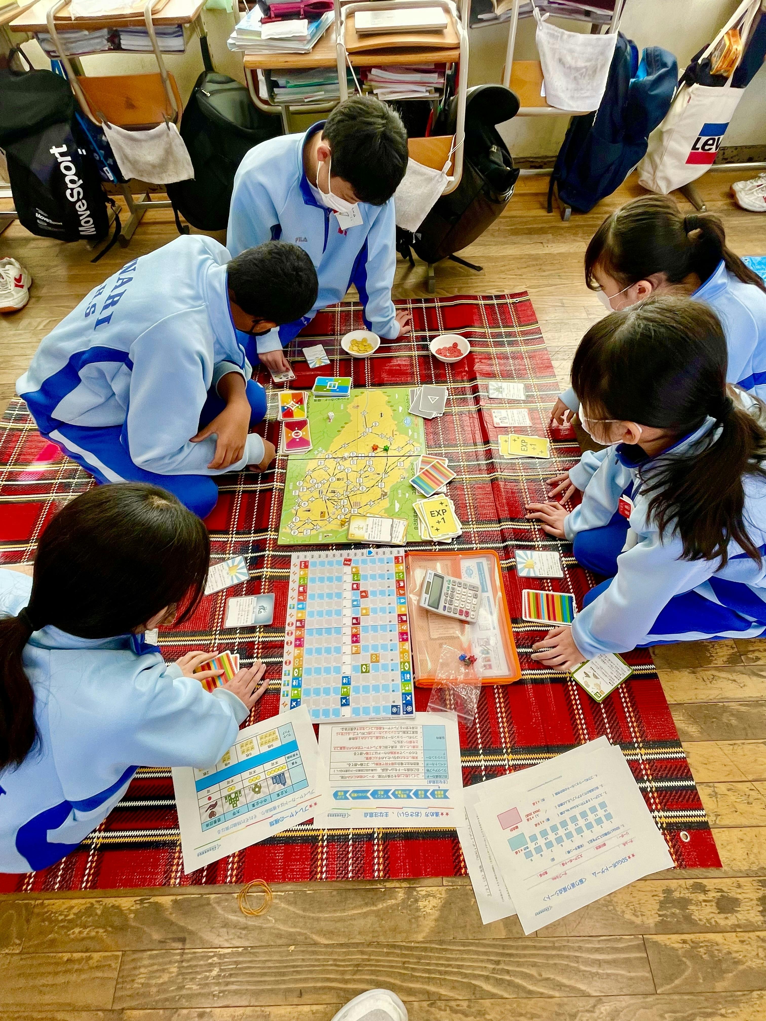 このSDGsボードゲームは、プレイヤー以外にも「お役」があり、生徒さんたちは、リーダー・銀行係・スコアーボード係、集計係の4つのお役を担い、またチーム名の決めて、チームワークの結束やリーダーシップの発揮、チームに対してお役で貢献することも体感できる秀逸なワークショップ型・参加型のゲームです。