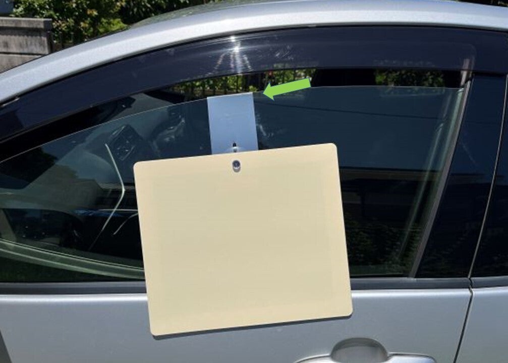 サイドガラスを10cm程下げ、下記図の矢印の透明シートのUの字に折れ曲った部分をサイドガラスに引掛け、位置が決まったら吸盤で固定しサイドガラスを上げます。左右のサイドガラスを行ったら完了です。